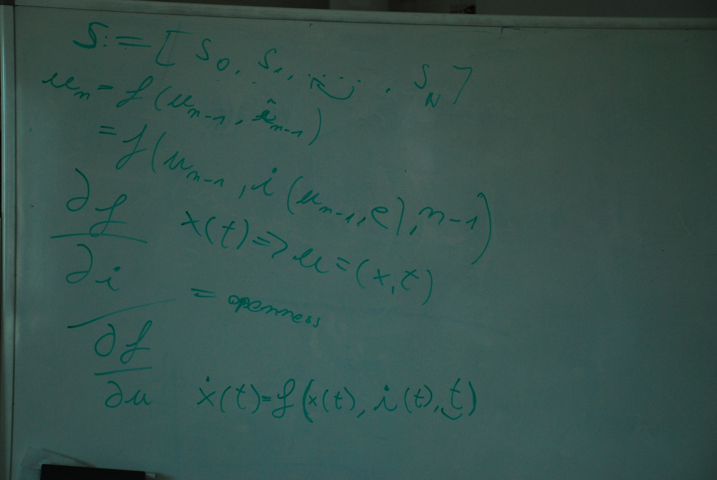In ALMAT, what interests me is how that changes what we are doing. We all have some conceptions and we try them out, we experiment, but the most difficult thing is to understand how this movement happens over time, because we are in time. So we can try to look back at our own sketches and notations from the previous iterations, and try to reimagine back how we were there. But it's very difficult somehow. I was thinking that, for example, one month ago we weren't talking about "recursivity". We didn't use the term "recursivity" but maybe only recursion. And so something enters, like recursivity and then it's like a magnet a little bit, like you attach the different things you associate with. You pick up some stuff, let's say this text, but can be with any text. He makes of course a lot of connections and they come all back. He's talking about cyberneticists and Wiener and Spencer Brown and you say "Ah interesting, that's true. This has to do with this". And that's in a way what he calls intensification. The idea that something gets saturated, that something, in a way, is a container but it gets saturated. But we carry it around, somehow. And then when we go back it's there. The difficulty is in qualifying how that influences what we are doing in the moment. But we know that's influencing what we are doing. So if I would go back and do a piece that has everything to do with recursion this stuff would be there, somehow. So it's impossible to take it out of the equation. And for me that's the interesting point about what agency maybe is, or about how agency is constructed. Our discussion is condensed and goes in there. This is one of the interesting aspects of the whole project, in a way. That's maybe a possibility to discuss how these concepts become things that are not just ideational, but somehow they become very concrete in the way we work. That's one possibility of this mattering, when you take Barad's idea of mattering: to matter in English means "to make sense, to mean something". So it becomes meaningful, somehow. But is difficult to observe the process of becoming meaningful.