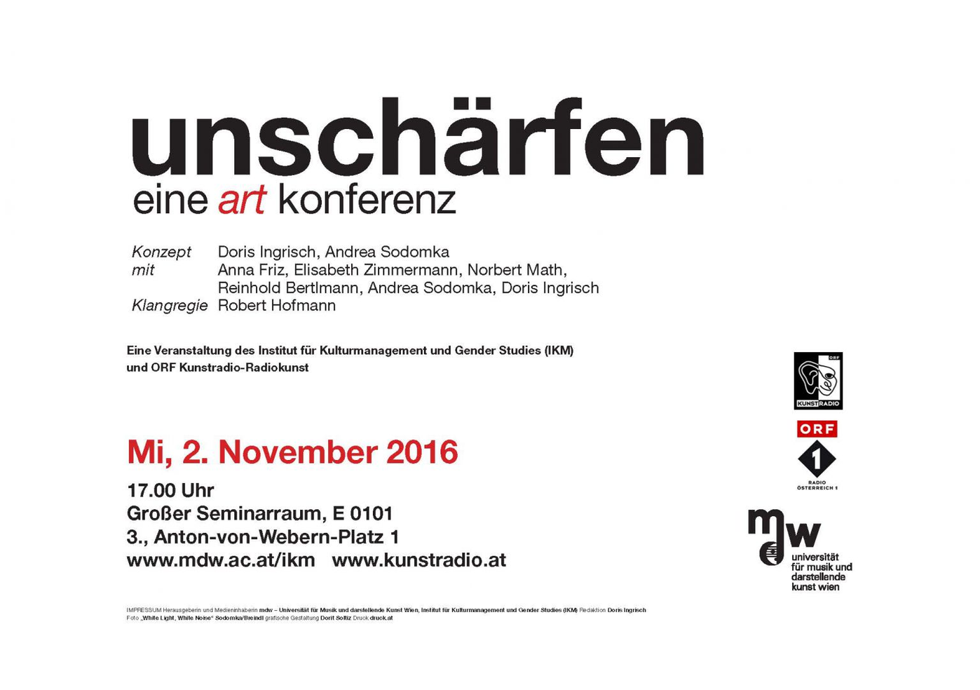 "unschärfen - eine art konferenz" - über die Unschärfen in und zwischen Kunst und Wissenschaft fand am 2. November 2016 als Projekt des Instituts für Kulturmanagement und Gender Studies (IKM) mit Ö1 Kunstradio-Radiokunst statt.