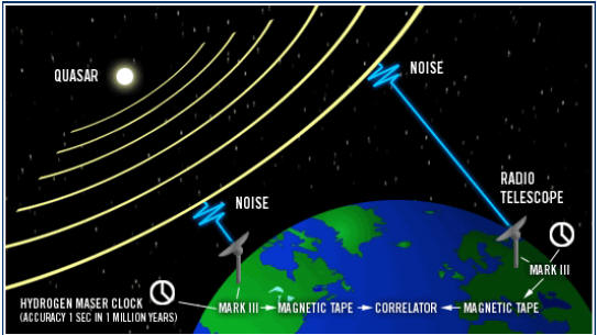 To be able to see an object that is this far away, we rely on the object to be a strong source of radiation. For the VLBI measurements, quasars (quasi stellar objects) are used due to their very intense radio wave emissions. A quasar can be described as a black hole, with an accretion disk (where matter is drawn into the gravity field of the black hole). Due to the immense pressure at the center, the quasar emits violent jets of radio waves perpendicular to the accretion disk. These radio jets can protrude several light years in each direction and these are the radiation signatures that we observe with our telescopes.