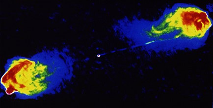 Radio image of a quasar (MPIfR), the tiny dot in the middle is the actual black hole, and the flame-looking signatures are the radio jets protruding several light years from the core