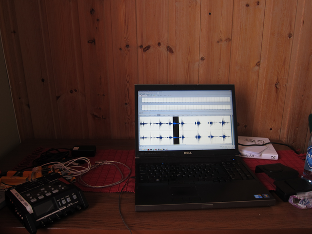 Post processing, editing recordings after a long day in the field. The soft light throught the curtains is due to the midnight sun (yes, already in April there is midnight sun)