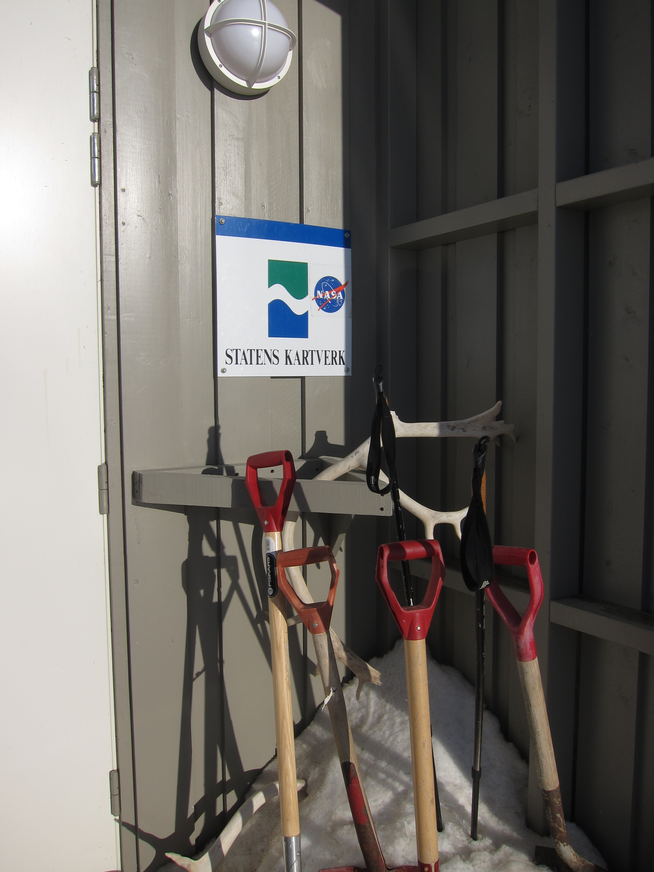 The entrance to the Mapping Authorities’ and NASA’s station in Ny Ålesund has snow showels and reindeer horns by the door…