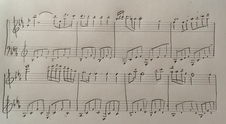 It can be exciting to play around with a theme of Hummel which is already ‘Mozartean’ in style with its detailed slurring and rhetorical expression. This fragment is from the Piano Trio in Eb major op. 93: