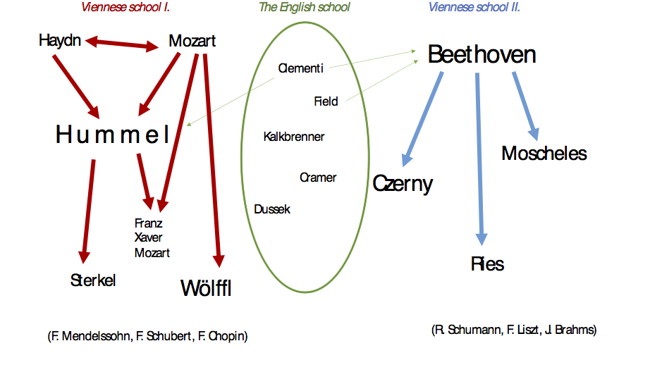 It seems clear that the two schools developed further and of course were not only determined by two names, but also by artists and composers who consciously belonged to either one of the two styles. This quote by Seyfried is golden evidence for this. And if that is so, the image of the classical style is already not so simple. Giving the important English school its due, I would like to draw the following imaginary panel about the coexistence of the two Viennese Piano Schools within the Classicism. The effects and influences are demonstrated with the arrows: