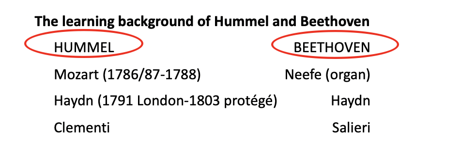 Hummel, who was born eight years after and passed away nine years later than Beethoven was much more of a contemporary to him than Mozart or Haydn. Their social background is not my focus; their educational development shows the most interesting details for this topic. The following list displays the similarities in their musical education:
