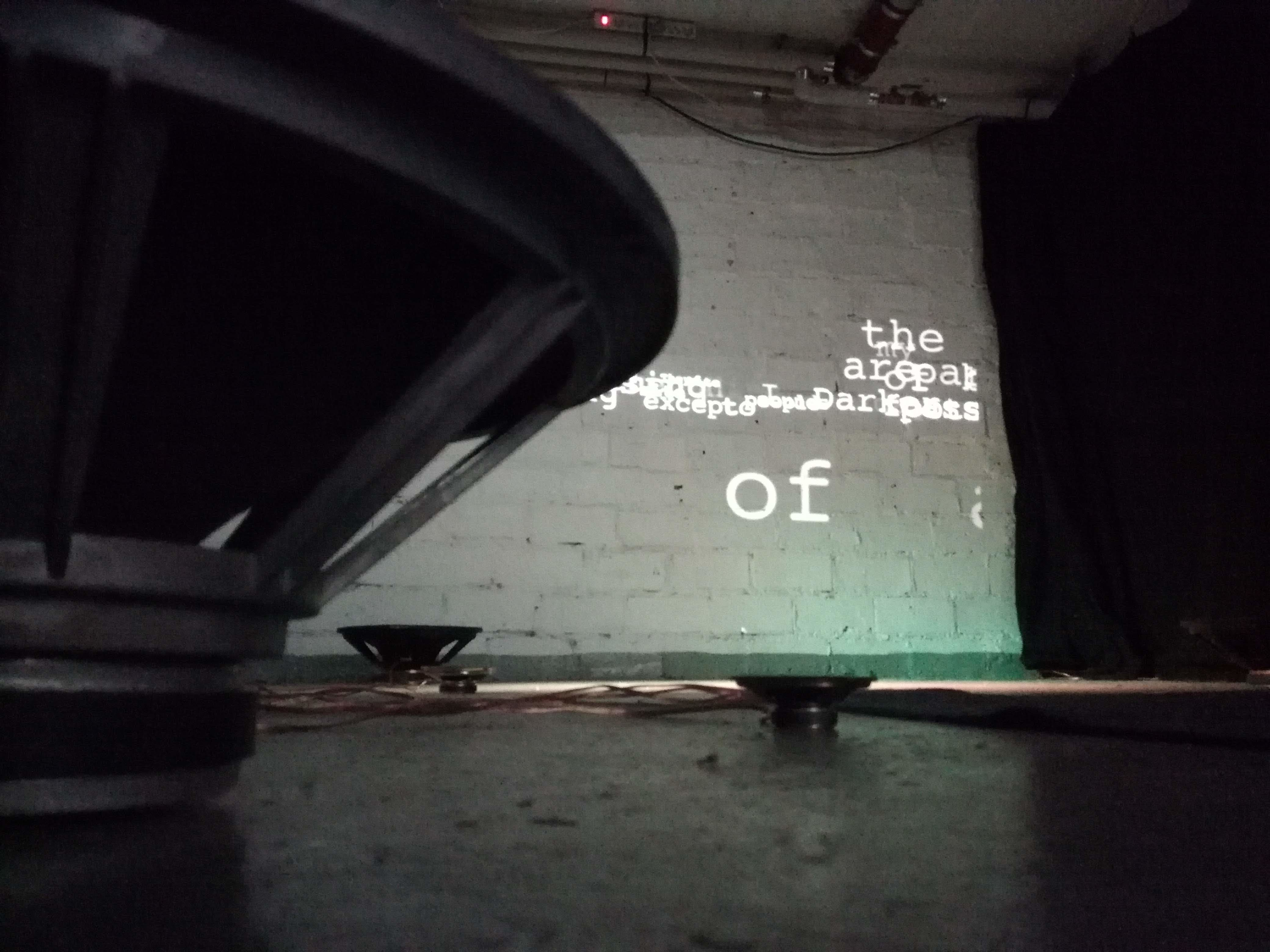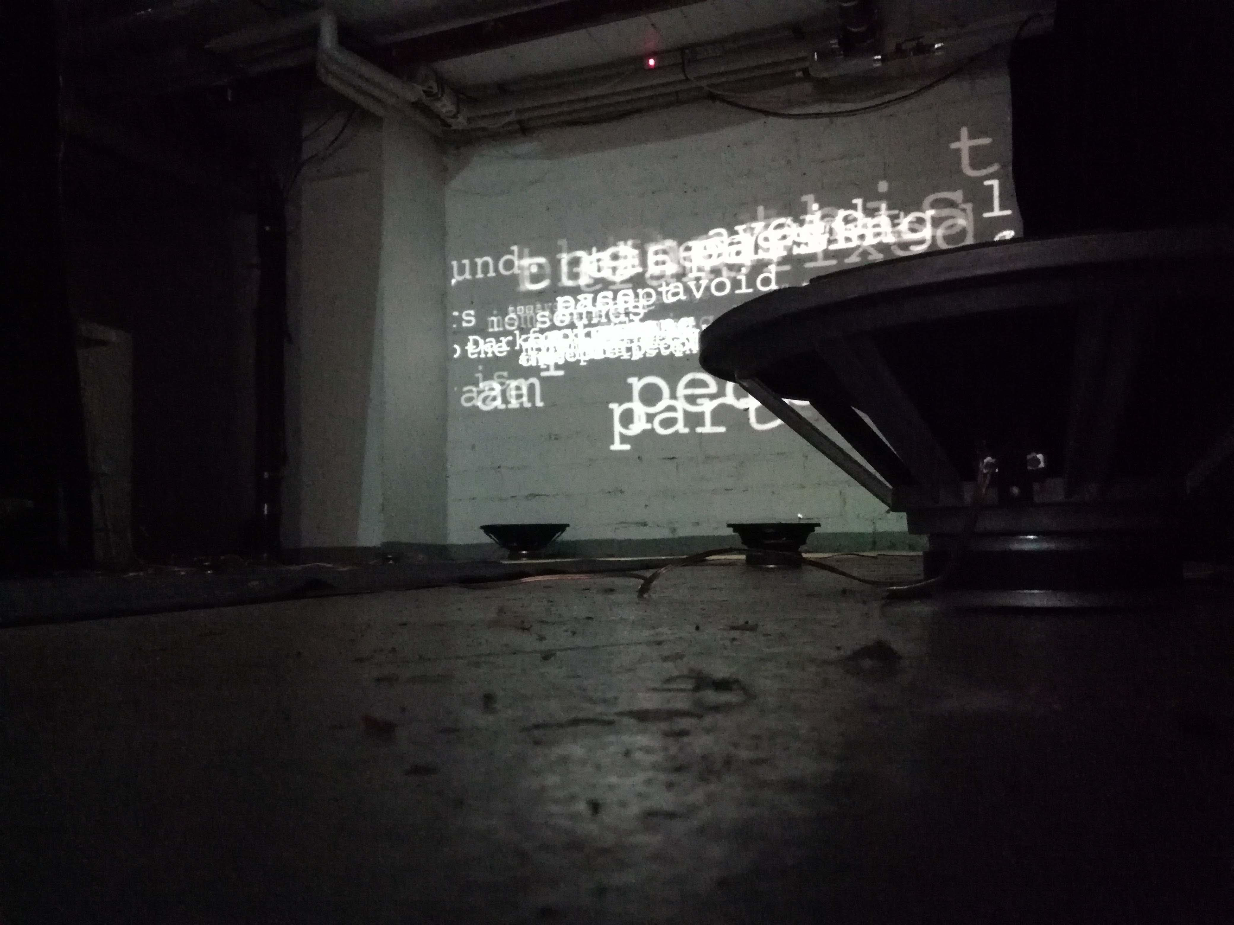 Another recent work Exile and Other Syndromes (2016 – 2018) also intends to create a discursive situation within an immersive space of multiscreen live visuals and multichannel sound diffusion. The work considers mindful aspects of the private mode of listening experience, and explores its introspective capacities for transcending the barrier of immediate meaning to touch upon poetic sensibilities. The work was produced during an artist residency at Kunstuniversität Graz, between September 2015 and January 2016. The pilot version (for 24-channel sound and 4-channel video projection) was premiered at Kunstuniversität Graz, on 19th January 2016. In essence, the work transmutes the urban space to reorient the navigational mode of listening involving the listener’s contemplation. The work incorporates multi-channel projection of sound-generated text-visualisation on the screens as moving images installed at a venue. This specific method of intervention can examine the way in which the memory, imagination and subjectivity of an itinerant listener elaborate the character of sound. The work relies on intuitive capacities of listening, rather than the ontological and epistemological reasoning involved in deciphering the immediate meaning of sound for mere utilitarian and navigational purpose. This capacity for inward contemplation, and poetic rupture through a formation of subjectivity available to wandering listeners traversing the urban environments enables the work to explore the transcendental possibilities embedded in everyday listening. Such capacity helps to counteract the neurosis of contemporary urban living. The particular emphasis on the poetic attributes of an expanded mode of listening provides a context for exploring the unexpected splendour of everyday urban sounds and their transcendental and emancipatory potential as evocative and unfolding situations beyond their site-specific and static object-hood. Emergence of such contingent moments of positive estrangements in the urban listening helps to keep a poetic distance from the immersive city experience expanding the Cagean idea of chance composition towards a context of fluid and nomadic interaction with everyday sounds in contemporary cities. The full version of the work was installed publicly during the festival Nacht van Kunst & Kennis, Leiden in September 2017, and exhibited (3-channel live visuals) at the Rogaland Kunstsenter as part of the Screen City Biennial, Stavanger, Norway, 12-31 October 2017, and was included in the Serendipity Arts Festival, Goa, India, in a group exhibition in December 2018.