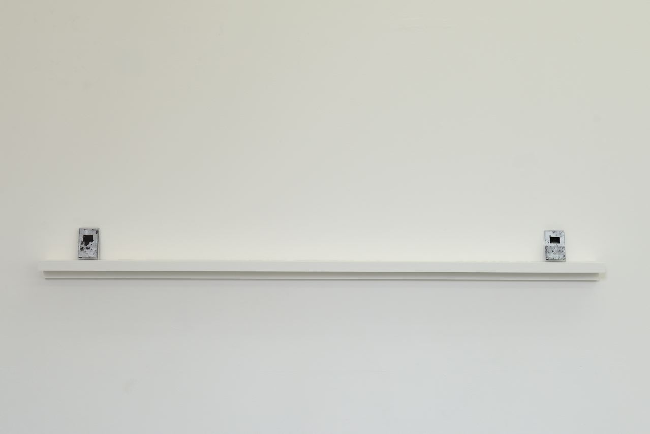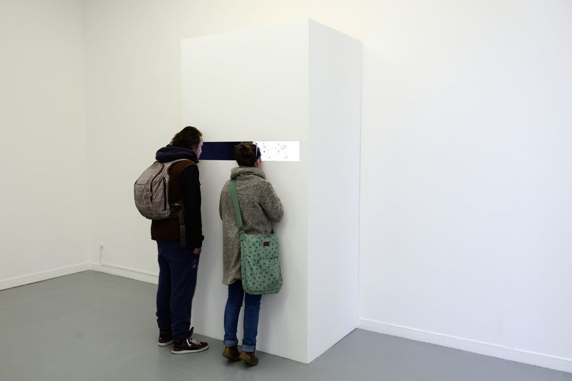 Devin King, The Moon on the Knock, 2010. Cassette tape box, ink, cardstock, slide film, led battery, 1/4 × 2 2 3/4 × 3/4". Installation view, Ghost Nature, La Box, ENSA, Bourges, 2014. Photograph by Pascal Vanneau.