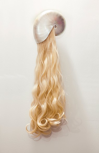 Jenny Kendler, Species Traitor I, 2013. Pearly nautilus shell, synthetic hair, glue, 21 × 6 × 3".
