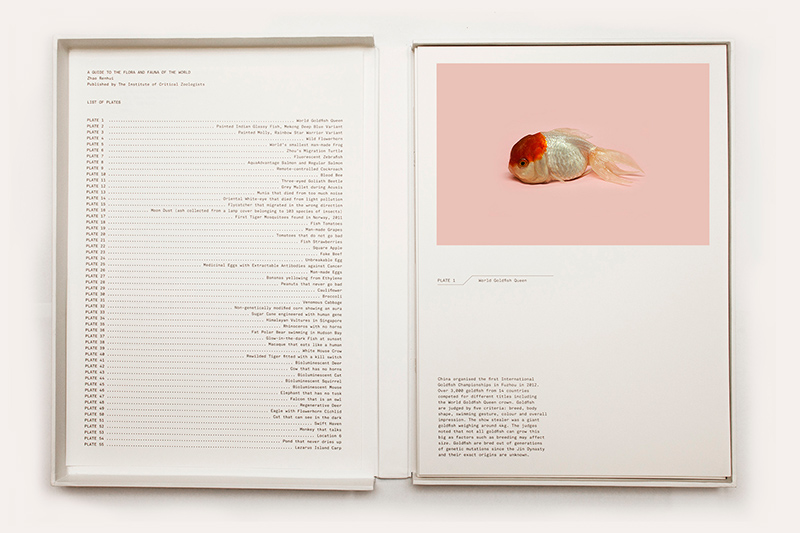 ‘A Guide to the Flora and Fauna of the World is an encyclopedia of man-made nature. It started of with the goldfish. Why doesn’t the goldfish have a scientific name? Why is it not included in any natural history encyclopedia? Today, the goldfish is a very common fish and in China they recently held a competition for the World Goldfish Queen. I wanted to find out if there was a book that the goldfish can exist in other than a decorative aquarium trade fish. I started looking at other aquarium fishes that were artificial and slowly branched out into other animals and plants affected by aesthetic modification, ecological conservation, pollution, evolution and genetic-modification. It took me about a year to create the volume. […] As a species, we have always defined and controlled the way nature existed with us and this is nothing new. Broccoli and Cauliflower are not natural although we have become so familiar with them. Man has always determined what nature should look and feel like. The way we think and look at Bonsai may offer us a way to contemplate our complicated existence with nature.’ – Robert Zhao Renhui, ‘Taxonomy for the Goldfish Queen: An Interview with the Institute of Critical Zoologists,’ Bad at Sports, 27 December 2013 <http://badatsports.com/2013/taxonomy-for-the-goldish-queen-an-interview-with-the-institute-of-critical-zoologists/> [accessed 17 February 2015]. Reprinted with emendations.