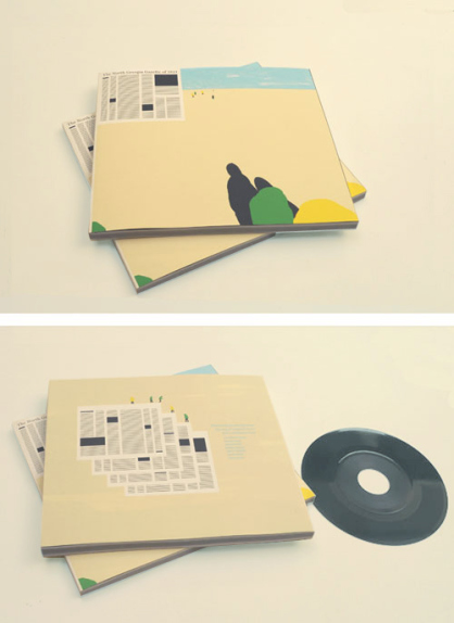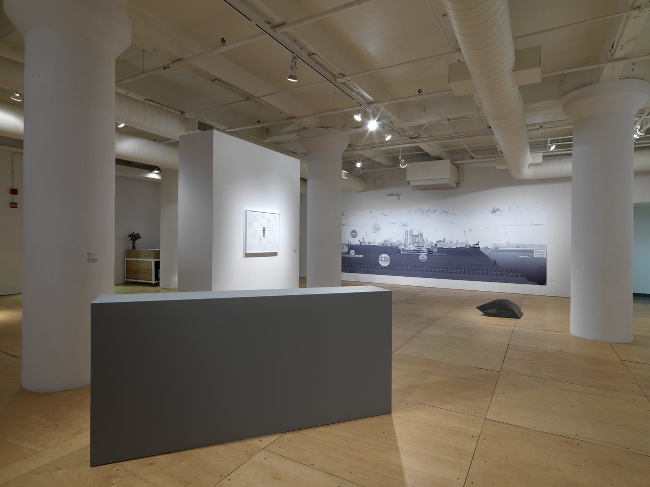 Top: The Green Lantern Press, The North Georgia Gazette (reprint of 1821 periodical by Sir William Edward Parry, the crews of the Helca and Griper, Lily Robert-Foley, and John Huston, with artwork by Dan Anhorn, Jason Dunda, Rebecca Mir Grady, and Deb Sokolow), edition of 500 with silk screen covers and 7" record by Nick Butcher. This book was originally published as part of a travelling exhibition, Isolated Fictions, the latest iteration of which took place in autumn 2014 at the Hyde Park Art Center. Right: Rebecca Mir Grady, ‘Timeline of Arctic Exploration’ (detail), The North Georgia Gazette, 2009. Below: Isolated Fictions, installation view, Hyde Park Art Center, 2014.