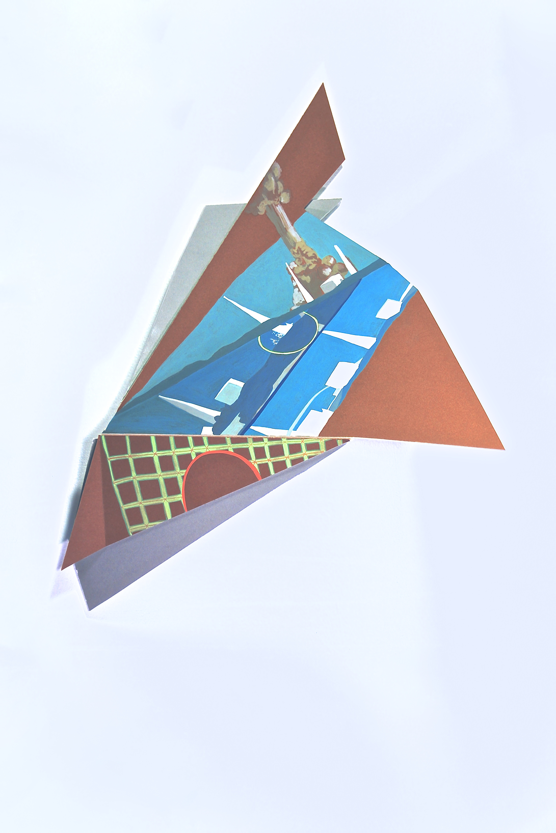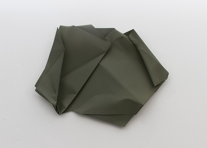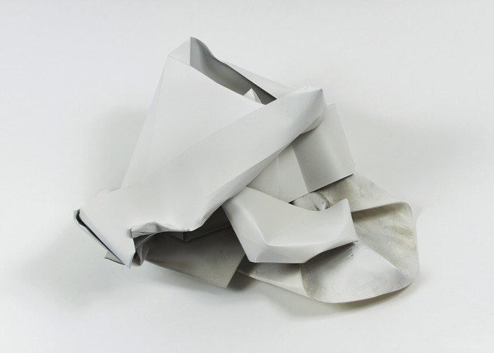 ‘To make the object, [Robert] Burnier cautiously works the once-flat material by way of improvisational folds. Recognizing the originating surface as a kind of pure two-dimensional potential, he interrogates the aluminum, exhausting certain possibilities as a three-dimensional shape emerges and thus becomes its own peculiar landscape. Burnier’s approach is almost collaborative; he is restricted in certain ways by the properties of the metal. As it responds to his interaction, the aluminium surface contributes to its own emergent personality. The process is systematic, yet also there is an element of chance, for certain folds will yield a more successful object than others, just as certain conversations yield more or less insight.’ – Caroline Picard, ‘Inland Delta: A Catalogue Essay for Robert Burnier’ [first published by the Andrew Rafacz Gallery, 2014] <http://www.cocopicard.com/writing/inland-delta-a-catalogue-essay-for-robert-burnier> [accessed 28 February 2015]. Reprinted with emendations.