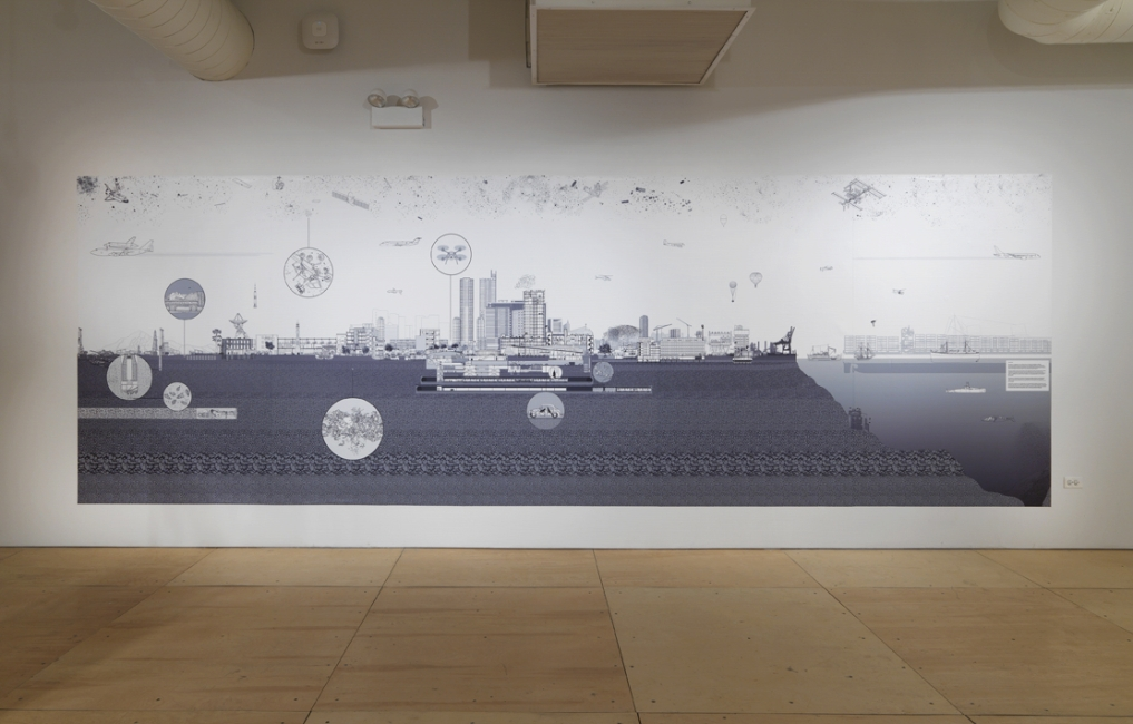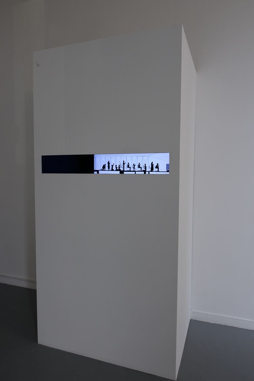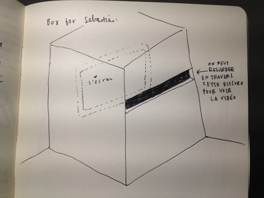 Above and Below Left: Sebastian Alvarez, Chronoscopical Society: Transection 02, 2014. Digital film (loop) inside wooden box. Installation view, Ghost Nature, La Box, ENSA, Bourges, 2014. Photograph by Pascal Vanneau. Above: Sebastian Alvarez, Chronoscopical Society: Transection 01, 2014. Vinyl adhesive on wall, 8 × 24'. Installation view, Ghost Nature, Gallery 400, Chicago, 2014. Photograph by Tom Vaneckye. Below: sketch for French installation (or ‘translation’) of Chronoscopical Society.