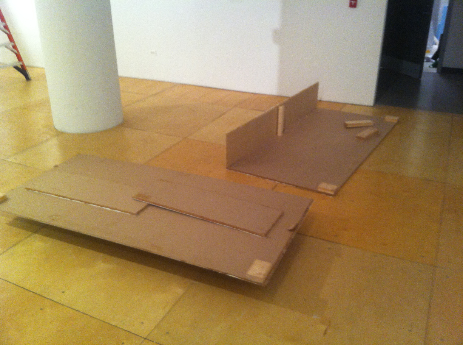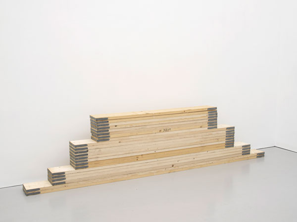 Marcus Coates, The Albatross Species, 2012. Twenty-two standard size scaffold, 142 × 32 × 22". Each board length corresponds to the wingspan of one of the twenty-two species of albatross. Image courtesy of artist and Kate MacGerry Gallery.