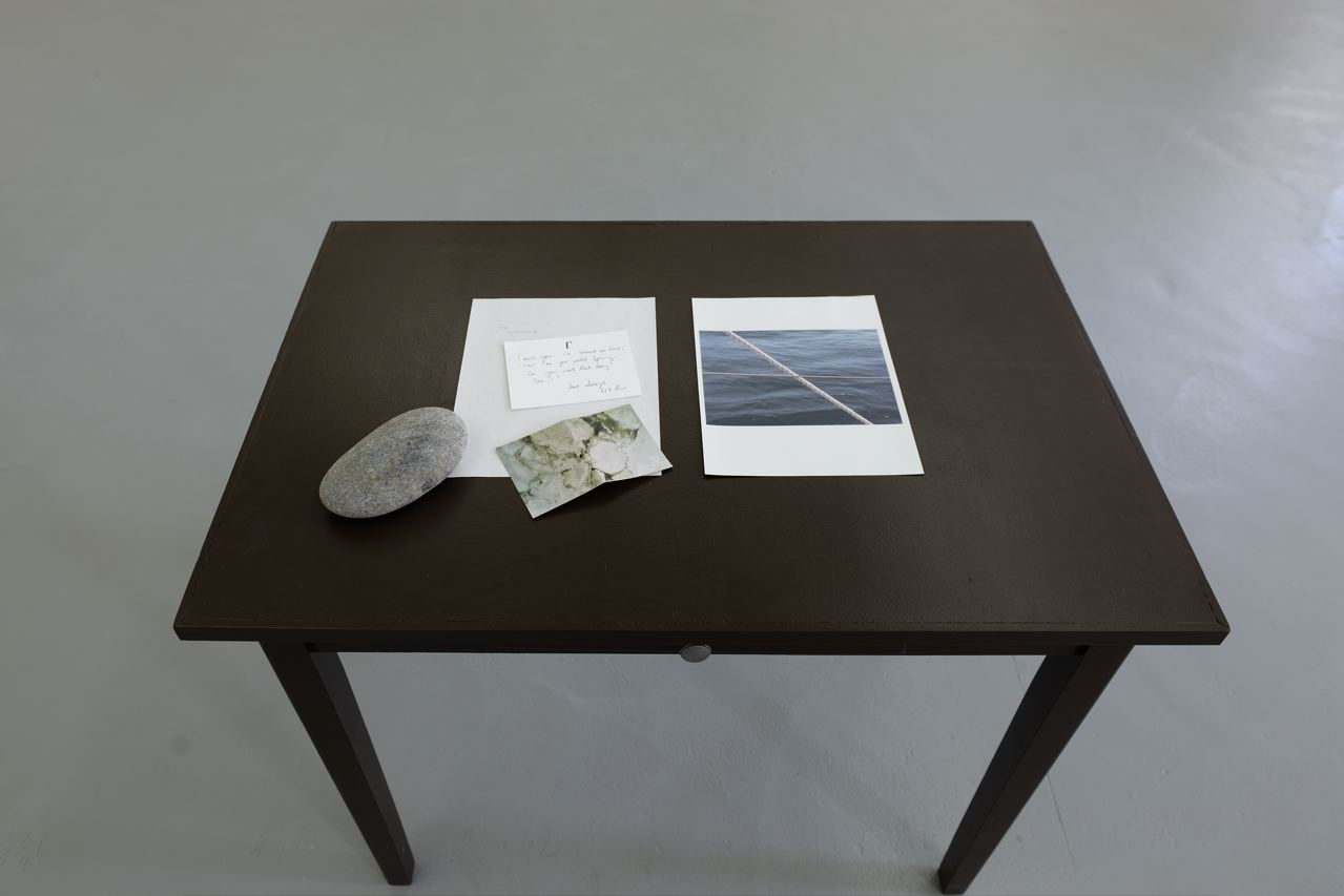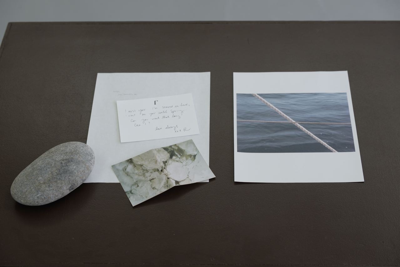 Above: Rebecca Mir Grady, Long Distance Relationship with the Ocean, 2013–. Table, letters, photographs, rocks. Installation view, Ghost Nature, La Box, ENSA, 2014. Photograph by Pascal Vanneau. Below: Rebecca Mir Grady, Love Letter to the Ocean. Right: Rebecca Mir Grady, excerpt from Long Distance Relationship with the Ocean (photograph of ocean).
