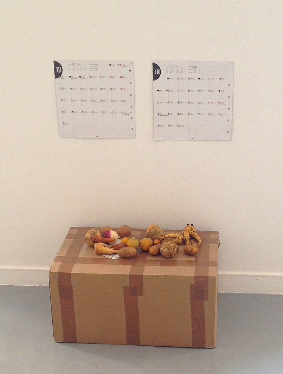 Stephen Lapthisophon, Duration, 2014. Installation, root vegetables, dirt, furniture, box, and time. Installation view, Ghost Nature, La Box, ENSA, Bourges, 2014. Photograph by Pascal Vanneau.