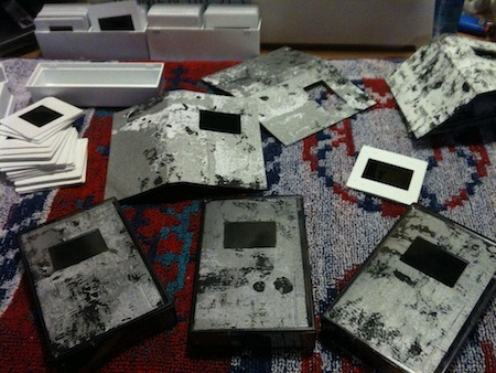 Devin King, The Moon, s/t, 2010. Cassette tape boxes, ink, cardstock, slide film, LED, batteries, 4 1/4 × 2 3/4 × 3/4".