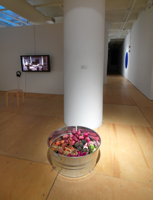Stephen Lapthisophon, Taking Care, 2014. Installation, root vegetables, container, and ice. Installation view, Ghost Nature, Gallery 400, Chicago, 2014. Photograph by Tom Vaneckye.