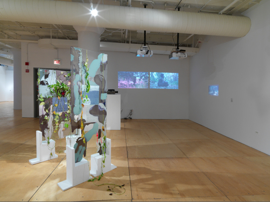 Ghost Nature, 2014, installation view, Gallery 400, Chicago. Photograph by Tom Vaneckye Left: Heidi Norton, Anaphase Mutated, 2014. Glass, resin, plants, paint, wood, 61 1/2 × 52". Right: Akosua Adoma Owusu, Anancy, 2012. Video and slides, 2:00 min.