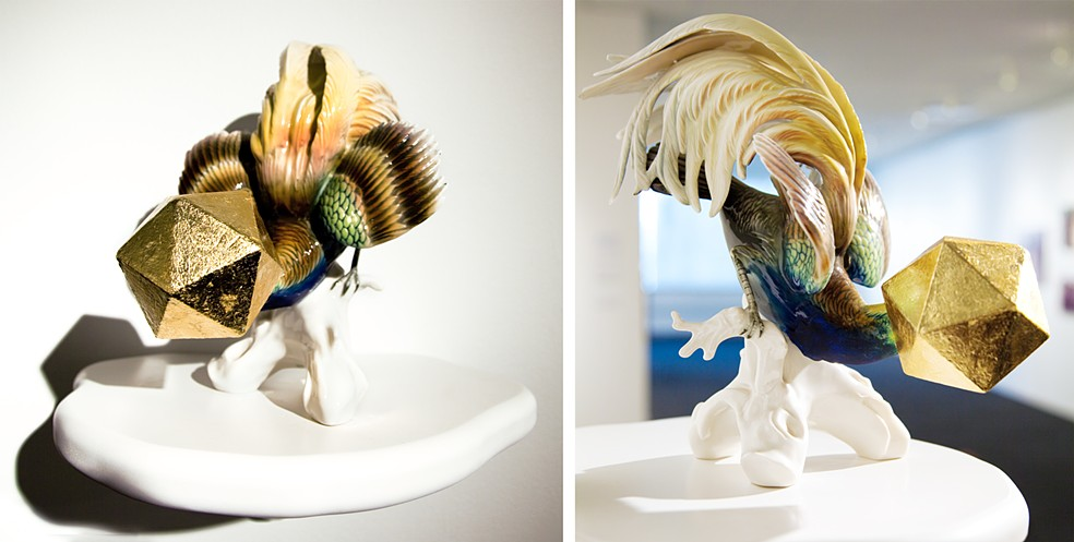 Jenny Kendler, Camouflage V (Ultra-Deflector for Endangered Bird of Paradise), 2013. Vintage porcelain bird, glue, paperclay, acrylic, gold leaf, 10 × 6 × 6".