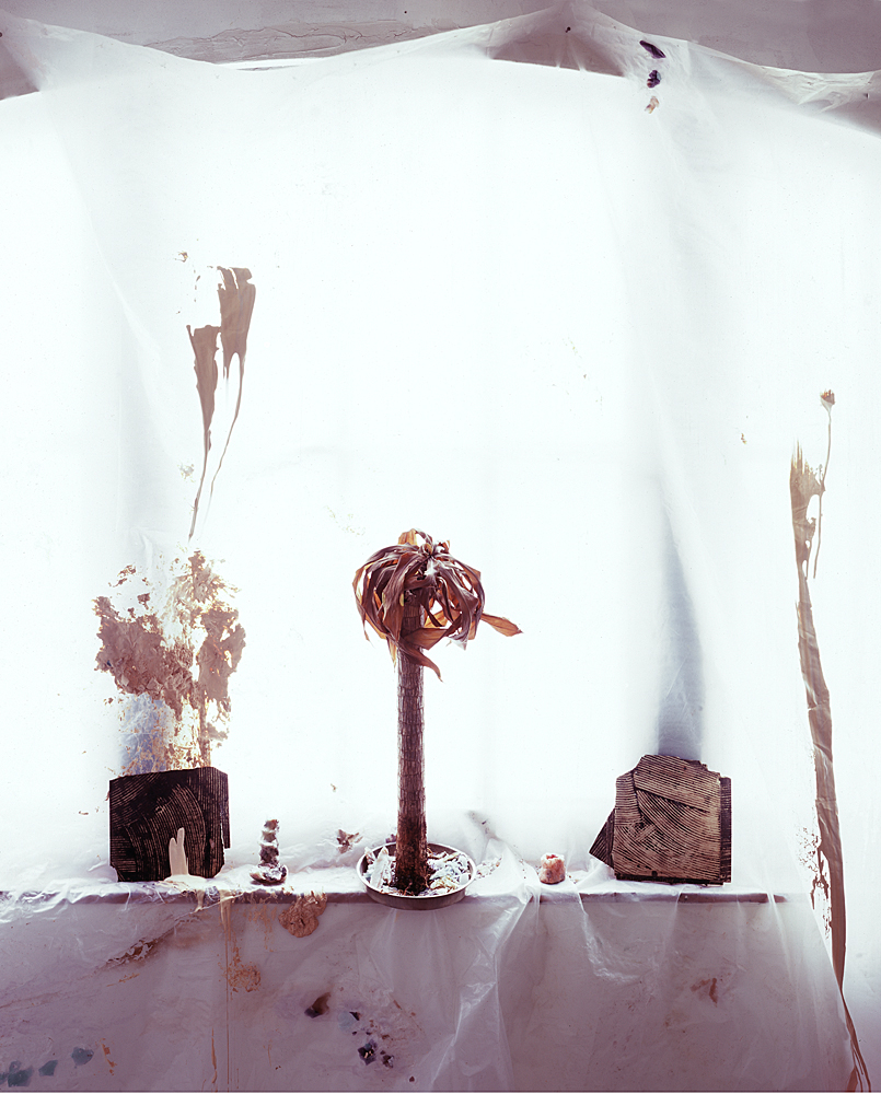 ‘One summer in my studio, I painted a plant white to be included in a still life photograph (the New Age Still Life series). When I returned it had grown out of the paint. The resilience of the plant floored me. How could this living thing, subjected entirely to such a toxic substance (I had hand painted every square inch) and blocked from receiving light, still be alive? And that was it. That was the beginning. At that point I knew that the plant was my material and I would search for ways in which to preserve it. The simplicity of their needs, their strength, their inherent ability to succumb – plants have been wired for centuries to withstand anything nature and time have handed to [them], even ice ages.’ – Heidi Norton, ‘Heidi Norton and Michael Marder’, interview by Monica Westin, BOMB Magazine, 24 March 2014 <http://bombmagazine.org/article/1000078/michael-marder> [accessed 18 February 2015].