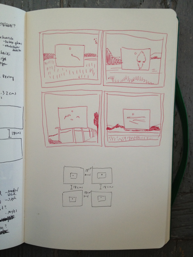 Above and Below Left: Sebastian Alvarez, Chronoscopical Society: Transection 02, 2014. Digital film (loop) inside wooden box. Installation view, Ghost Nature, La Box, ENSA, Bourges, 2014. Photograph by Pascal Vanneau. Above: Sebastian Alvarez, Chronoscopical Society: Transection 01, 2014. Vinyl adhesive on wall, 8 × 24'. Installation view, Ghost Nature, Gallery 400, Chicago, 2014. Photograph by Tom Vaneckye. Below: sketch for French installation (or ‘translation’) of Chronoscopical Society.