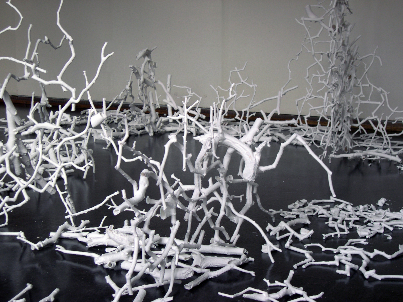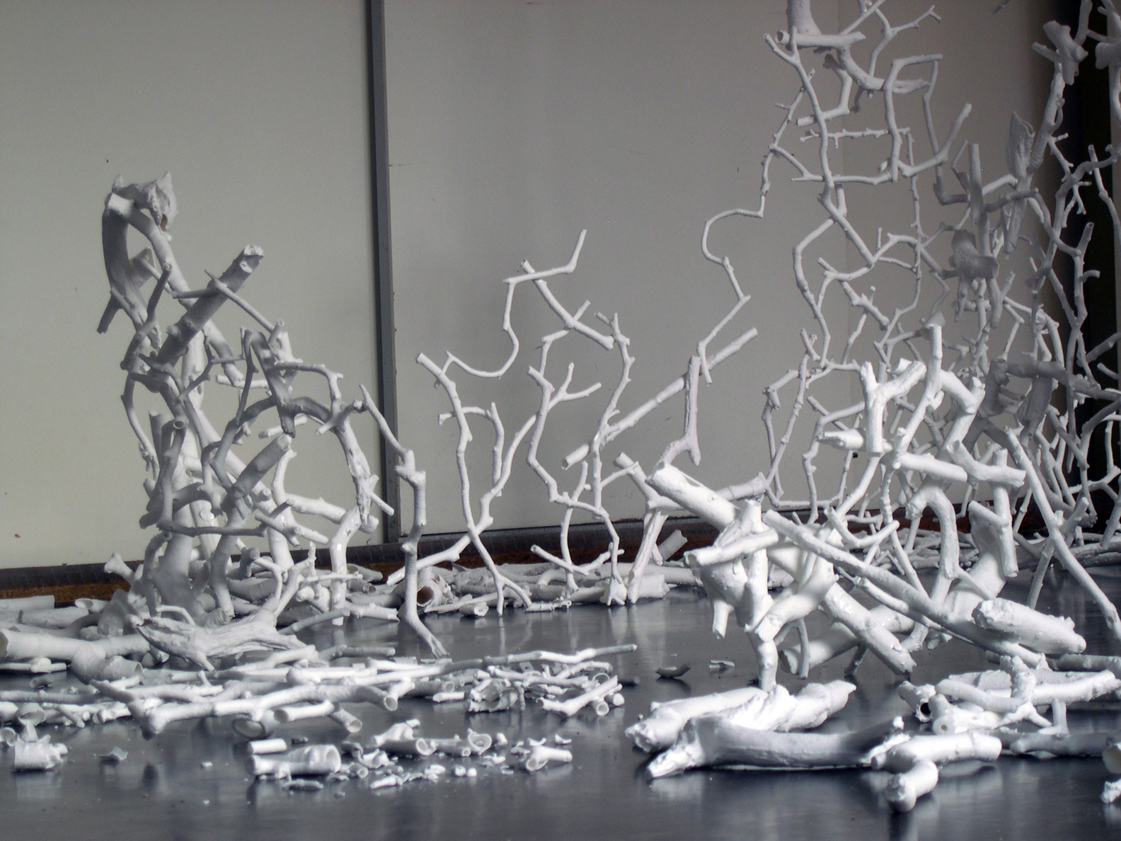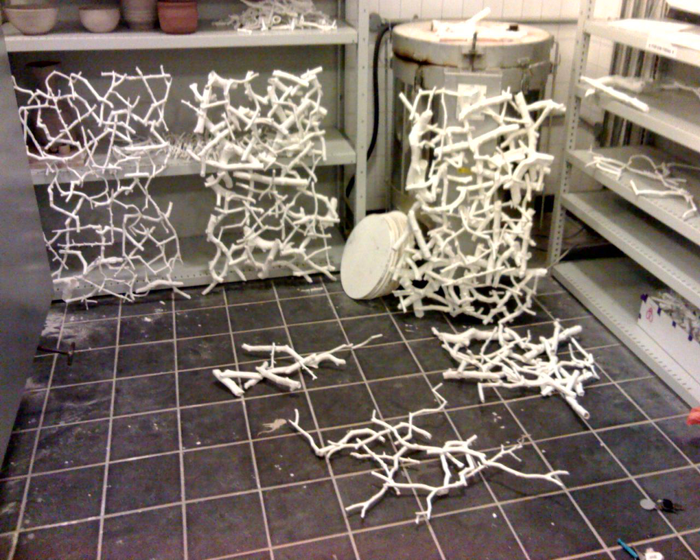 The broken coke can sculptures never worked because they missed risk and the threat of annihilation. My initial dissatisfaction with them had been the inauthenticity of the ‘wholeness’ but even after damaging them I did not feel I had escaped this aesthetics or structure. I was seeking this sense of threat to the entire structure, of risk. Bone china contains the risk of complete annihilation in its propensity to shatter. This started with my risking shattering the few twigs as I carried then and became much more evident as I started working on a larger scale to glaze twigs together in sections to create walls of china precariously balanced for fragility.