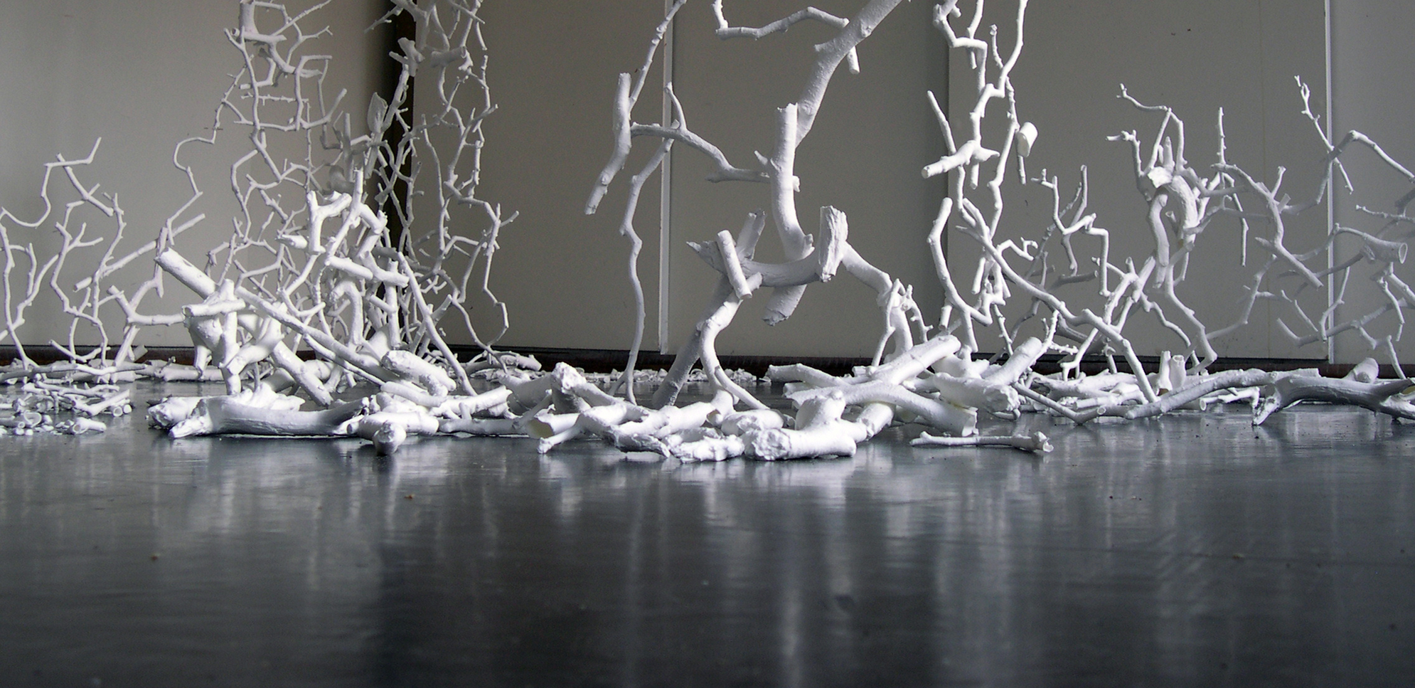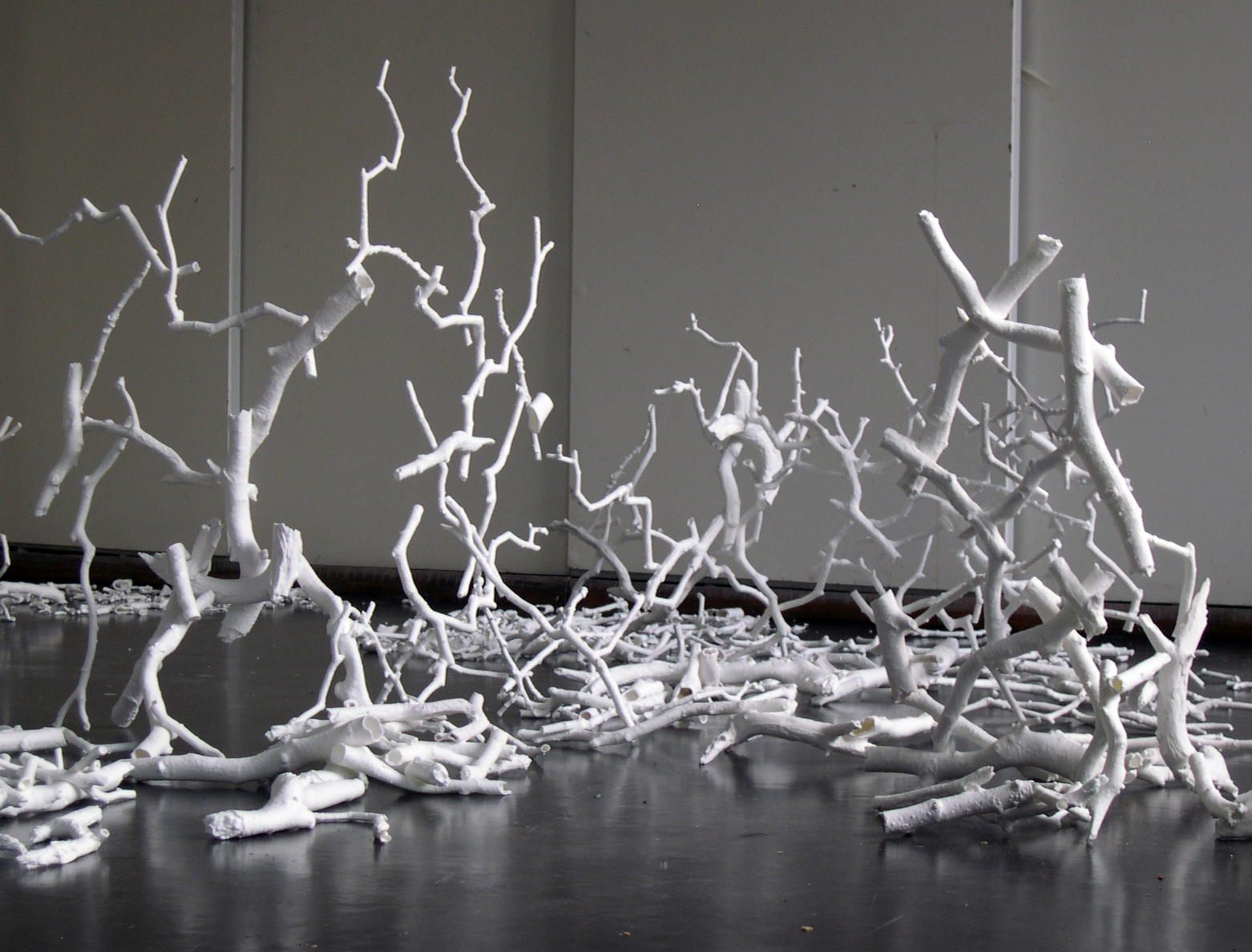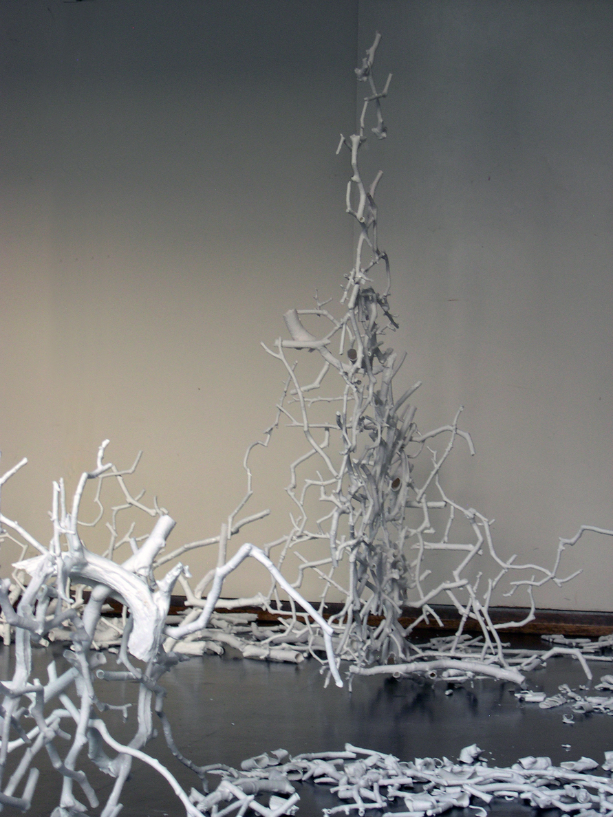 The broken coke can sculptures never worked because they missed risk and the threat of annihilation. My initial dissatisfaction with them had been the inauthenticity of the ‘wholeness’ but even after damaging them I did not feel I had escaped this aesthetics or structure. I was seeking this sense of threat to the entire structure, of risk. Bone china contains the risk of complete annihilation in its propensity to shatter. This started with my risking shattering the few twigs as I carried then and became much more evident as I started working on a larger scale to glaze twigs together in sections to create walls of china precariously balanced for fragility.