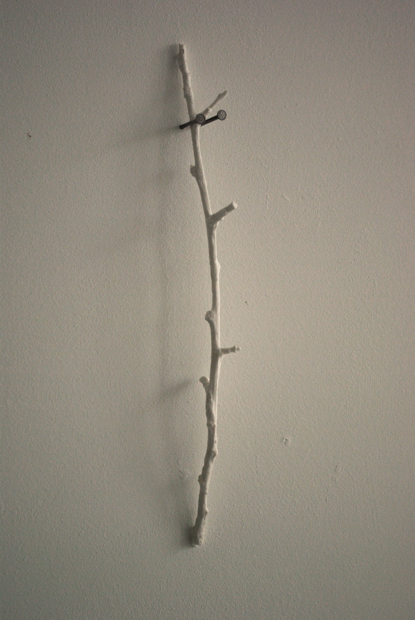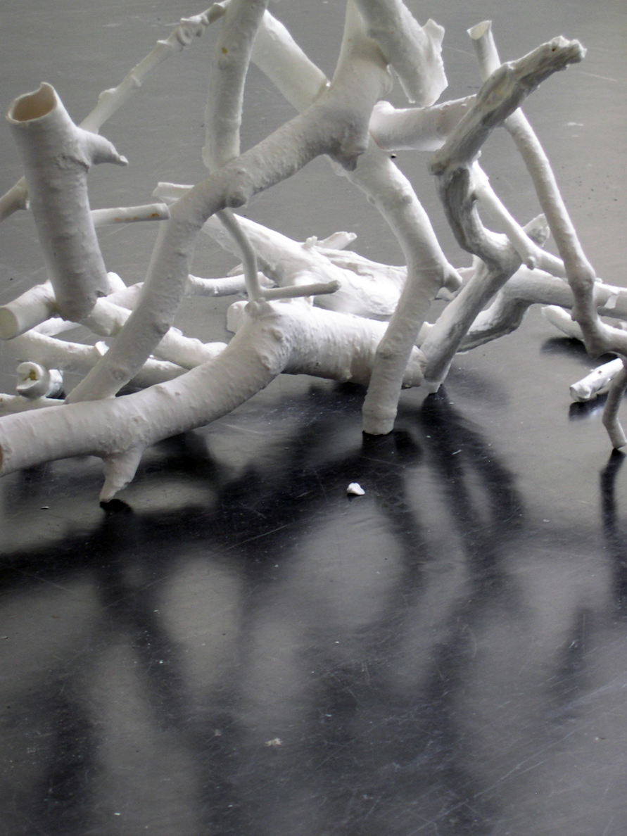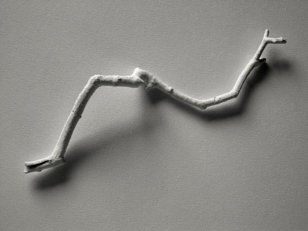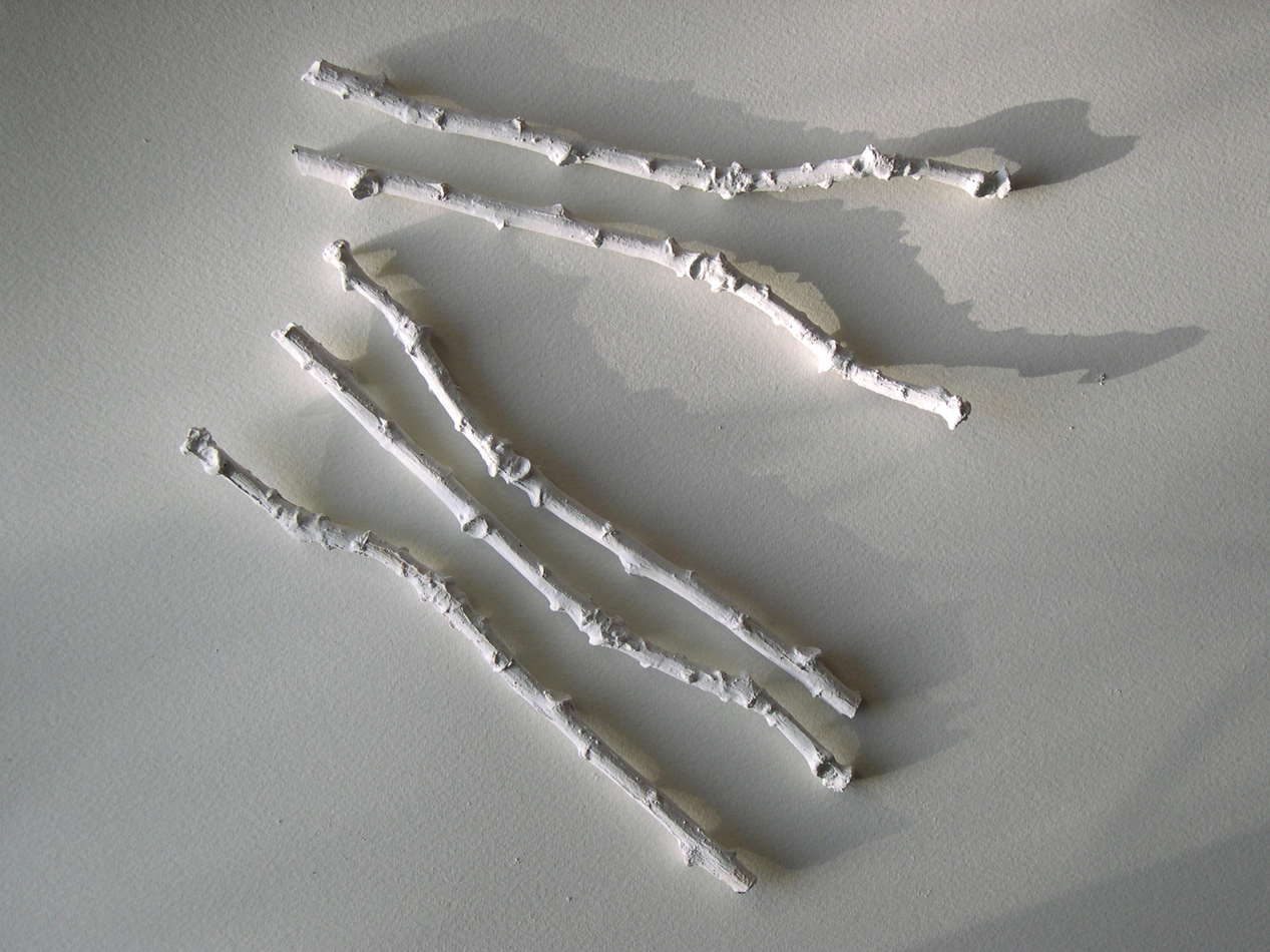 I was attracted to the bone china by its apparent fragility and associations of accidentally breaking china in the home. I had been drawing trees supported by crutches in Japan and saw the branches as limb-like and this inspired me to use twigs and braches from trees to cast in bone china. To make the bone china twigs I create a plaster mould of the original twig and then pour in a layer of bone china slip. I leave the moulds for a couple of hours until the clay is plastic and then take the moulds apart to remove the china twig. I am tense as I take the mould apart, hoping that the twig will be whole and not have cracked from over drying. If it is whole I continue to work very slowly and carefully to remove it in one piece since they can suddenly break at any moment.