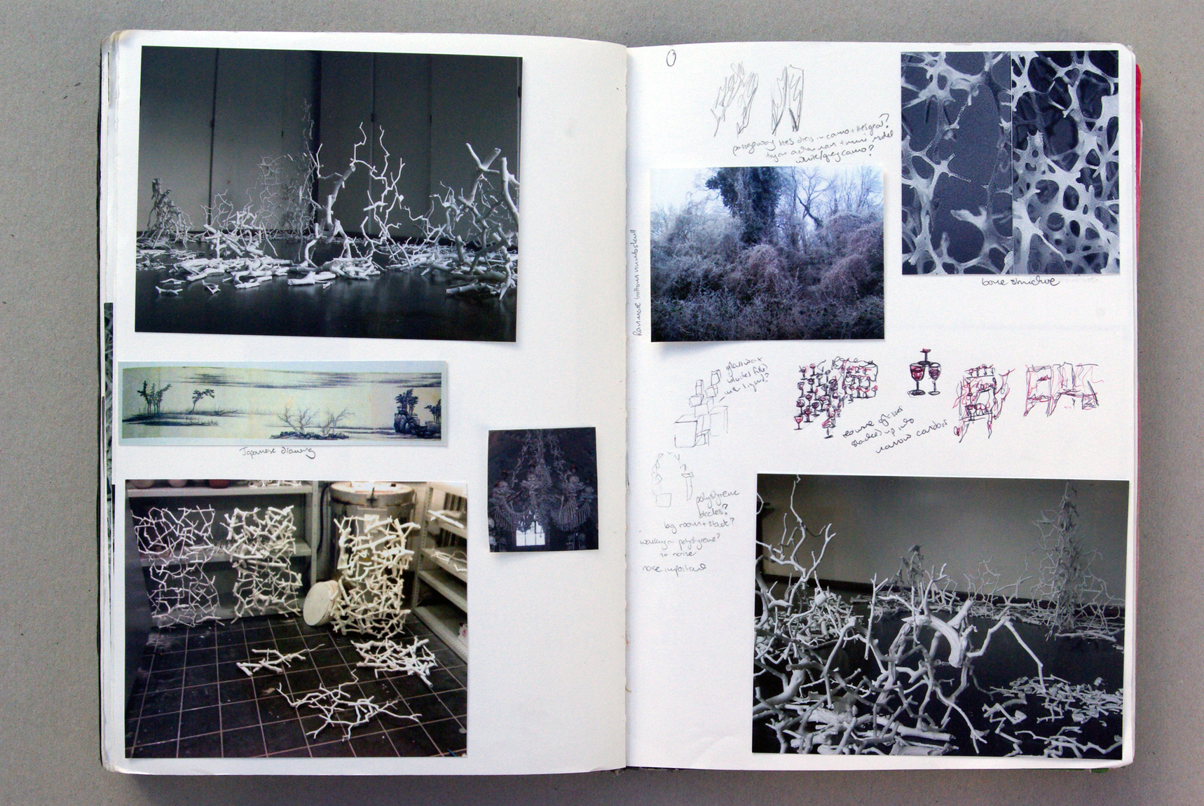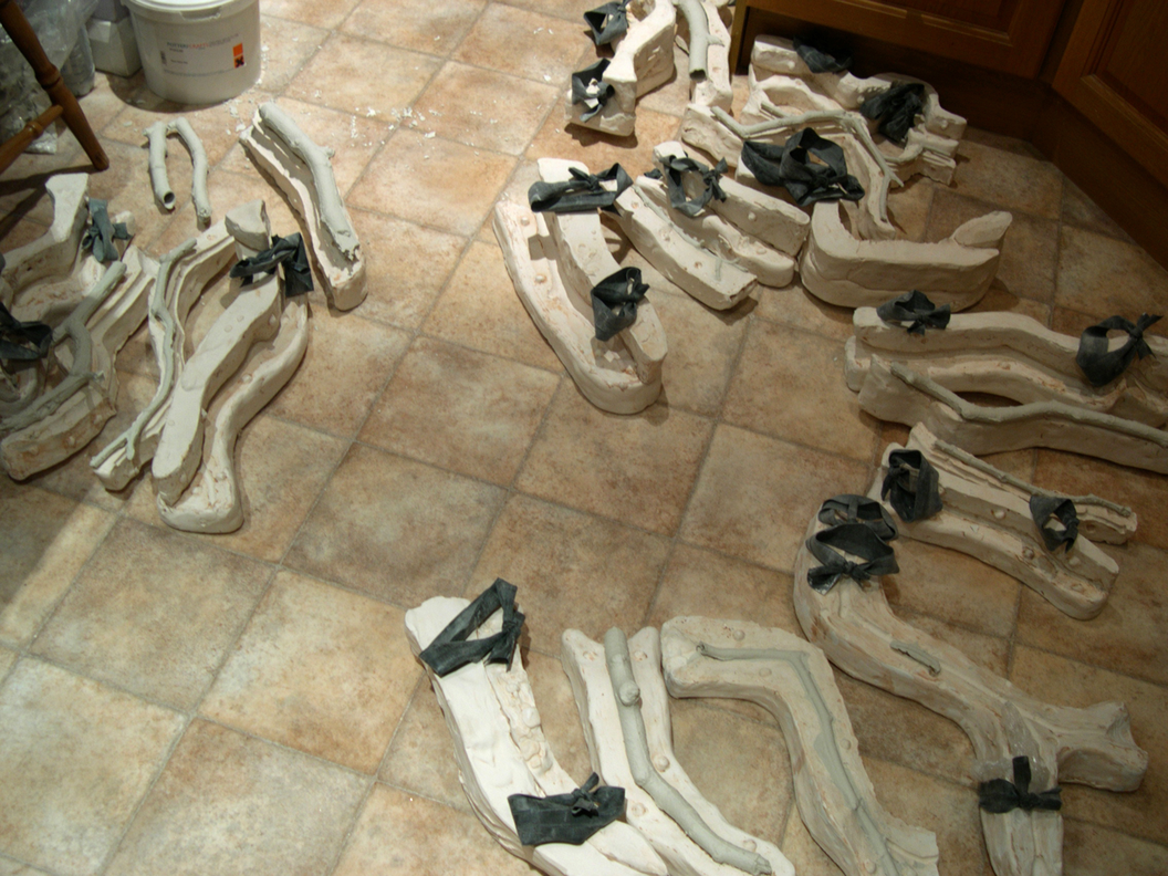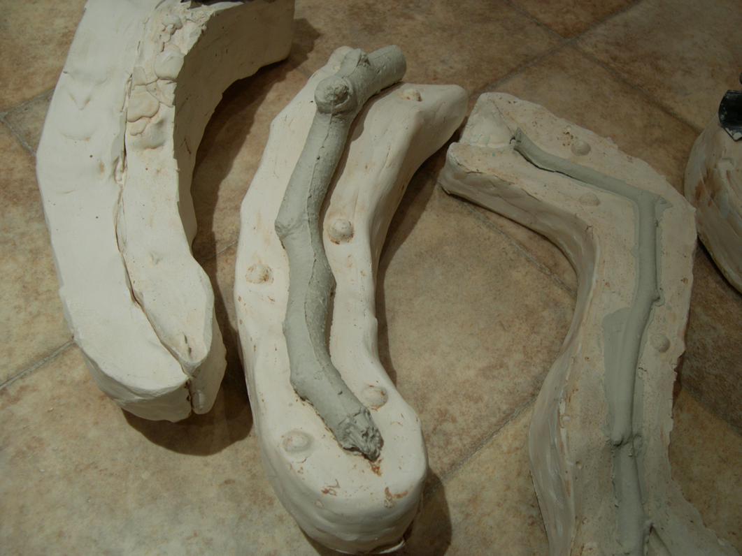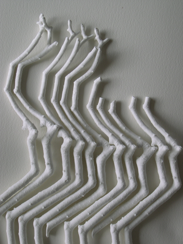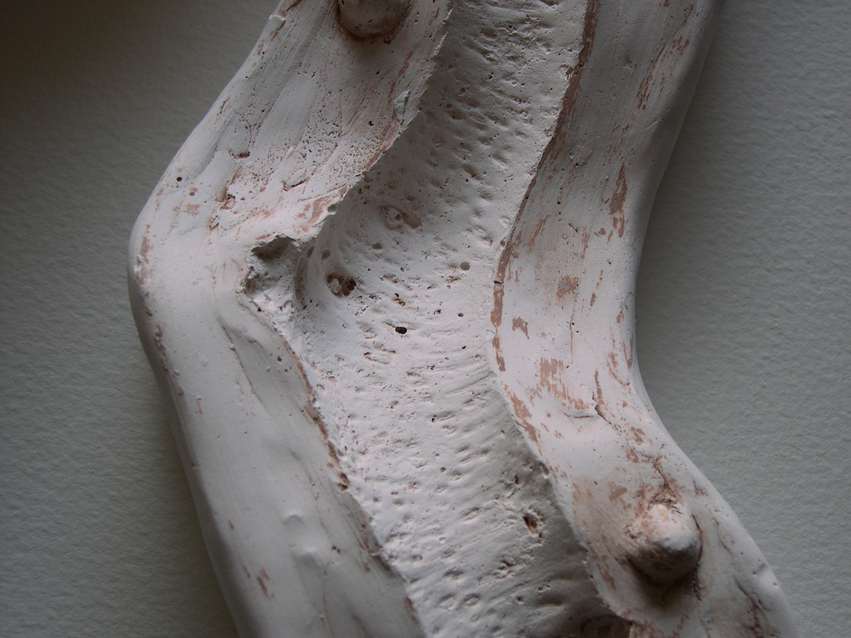 I was attracted to the bone china by its apparent fragility and associations of accidentally breaking china in the home. I had been drawing trees supported by crutches in Japan and saw the branches as limb-like and this inspired me to use twigs and braches from trees to cast in bone china. To make the bone china twigs I create a plaster mould of the original twig and then pour in a layer of bone china slip. I leave the moulds for a couple of hours until the clay is plastic and then take the moulds apart to remove the china twig. I am tense as I take the mould apart, hoping that the twig will be whole and not have cracked from over drying. If it is whole I continue to work very slowly and carefully to remove it in one piece since they can suddenly break at any moment.