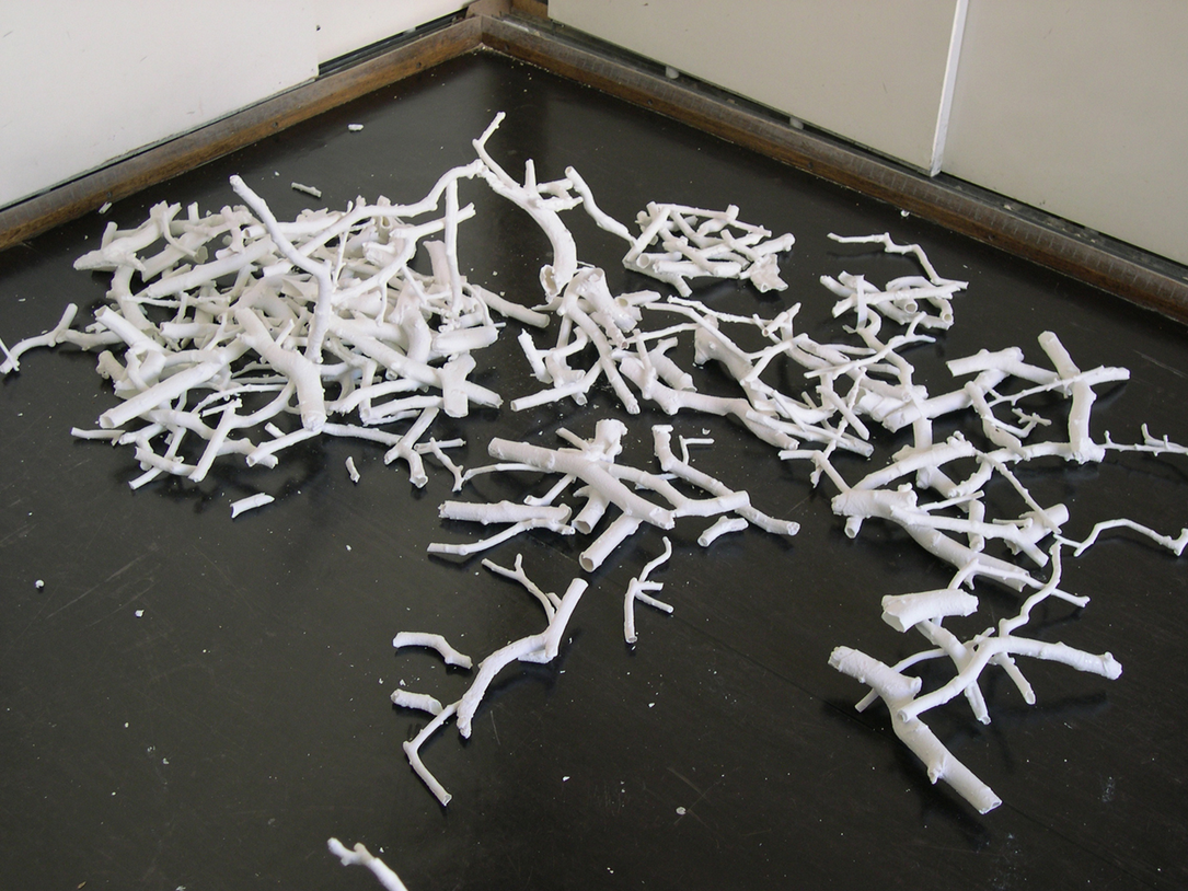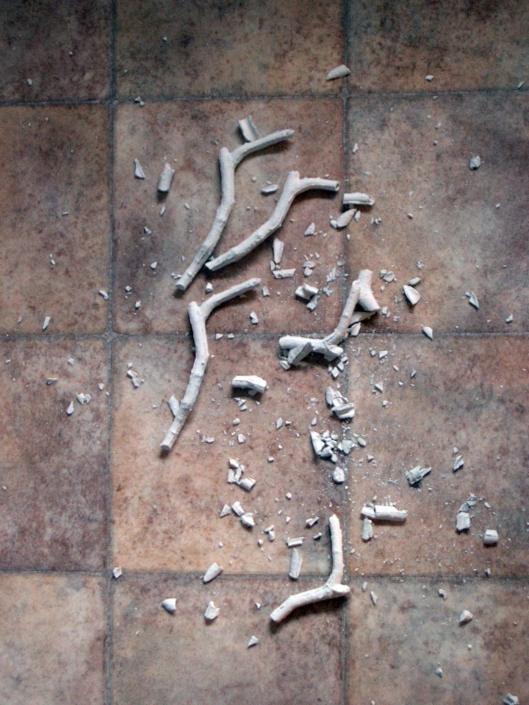 As many months went by of working with the china twigs I found that although I was attracted to preserving the china twigs ‘wholeness’ at the same time I was becoming increasingly annoyed by needing to be so careful with them. It didn’t affect me in the beginning; it was only after several months of working with the twigs that I noticed my patience wearing thin. It became a relief to deal with the broken ones which I could treat roughly without worrying about damage. Having said this, at every stage of the process I have enjoyed taking risks with the ‘whole’ ones to the point of almost deliberately manhandling them. In her book Risk Deborah Lupton (2013: 211) notes the pleasure experienced in taking risks whilst still feeling in control. As I became more adept in handling the unfired china twigs I started to pick up a couple in each hand rather than moving them one at a time. The feeling of dexterity as I learnt to know the limits of the china and for my hands to respond to this made me feel masterful. This progressed until at one point I tried to carry six or seven particularly fragile unfired twigs in one go. I knew this was too many to carry at one time and there was no reason to do this but it was tedious carrying twigs individually. It was exciting to feel the mass of fragile forms in my hands and to have to really concentrate on handling them so carefully. There is an enjoyment in pushing the limits with them, in courting disaster. Maybe pushing the limits of handling the twigs is a way of overcoming the increasing annoyance in having to be so careful all the time.