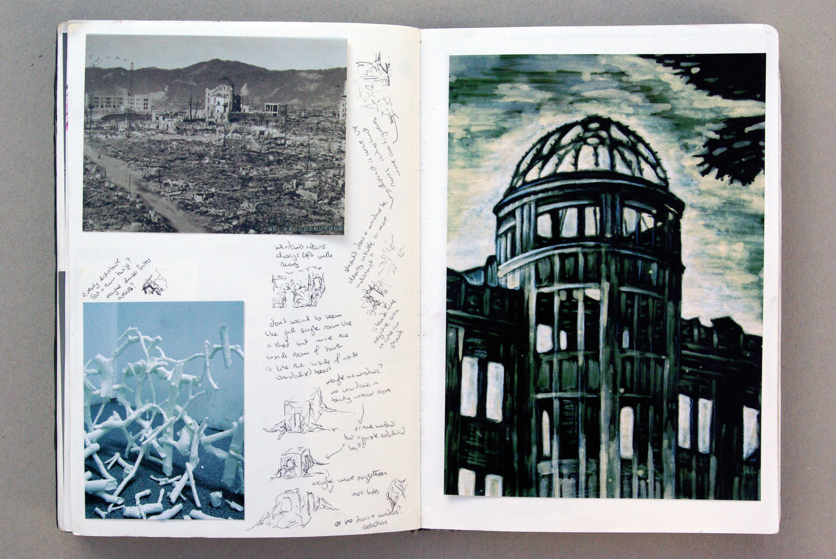 I felt the ‘whole’ sculptures were controlled and restricted in their structure; in work prior to my PhD I had always disrupted structures but this had never occurred with these. I broke the whole sculptures hoping to reintroduce the disruption. However, these intentionally broken ones never had the same feel as that first one that the roof fell on. They were too composed, too consciously arranged. Only the first one remained closest to breaking this ingrained control. In moving on from here I decided to find a less predictable and flexible material and thought of bone china due to its content of 40% bone ash relating to my broken bones.