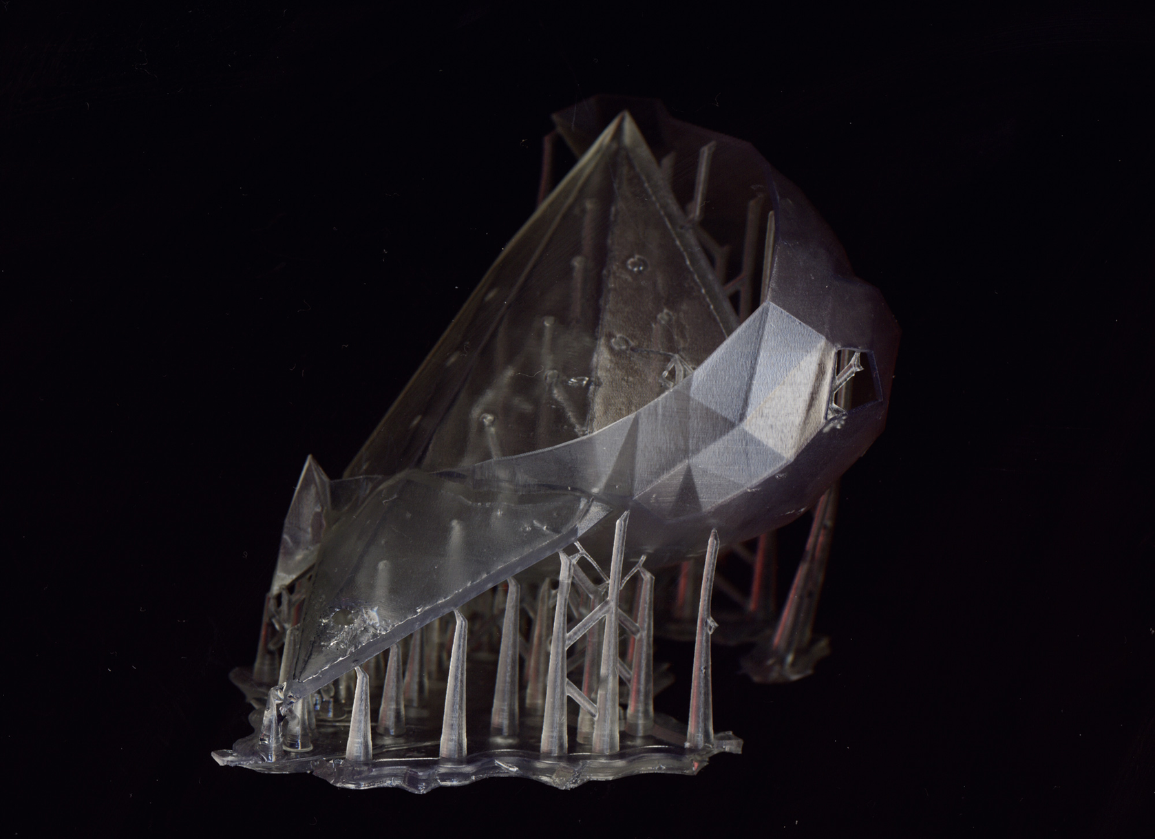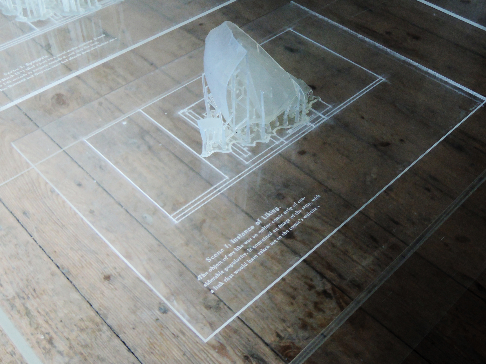 To extend Rancière's dissensual place further, I removed the resulting stereolithic prints further from the conventional setting of algorithmic system interfaces; namely into a gallery context. Through observation, I focused on how visitors would react and attribute meaning to the artifacts. To add a discursive prompt, I took a lead from Rancière's extensive discussion of the dissensual in the theater of Edward Gordon Craig1. Accordingly, I introduced prosaic accounts of the activity of "Liking" that I had rendered into the interfacial artifacts.