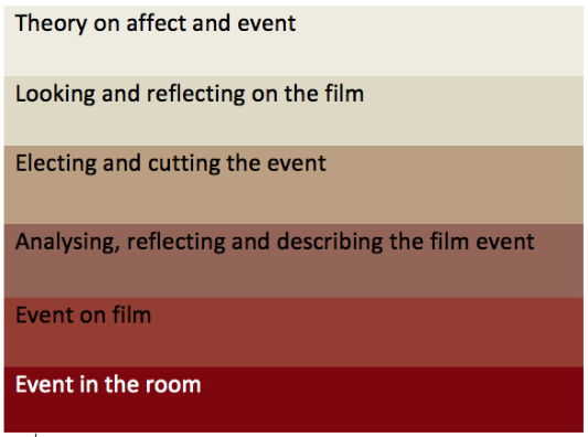 The events within the performance can be identified as follows: the improvised event in the room, the fixed event caught inside the camera frame, the creative event of looking and selecting what is significant in the event, writing the narrative, and, finally, the event of looking at the film and reflecting (even theoretically) on how the represented event can be understood.