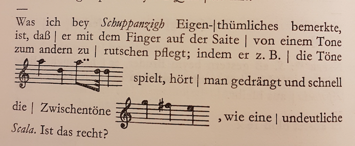 It is also interesting to note that Ignaz Schuppanzigh (1776-1830), a greatly admired early-19th-century violinist who worked very closely with Beethoven and Schubert,75 was praised by Beethoven for his portamento use. Beethoven stated in c1824, “What I noticed particularly about Schuppanzigh was that he took care to slide his finger on the string from one note to another, so that when he played you heard all of the intervening tones, fast and condensed, like a blurred scale” (Fig. 2.11).76