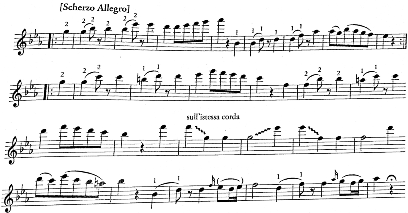 [Geminiani] was certainly mistaken in laying it down as a rule that 'no two notes on the same string, in shifting, should be played with the same finger,’ as beautiful expressions and effects are produced by great players in shifting, suddenly from a low note to a high, with the same finger on the same string.40