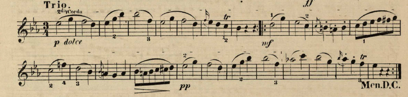Similarly, Baillot also made note of using portamenti in sul or una corda (single string) passages to emphasise the unique voice of each individual string,58 such as the “The E string, which has a clear and silvery timbre, and some of its tones can be considered an extension of the voice.”59 Una corda (single string) markings can be seen throughout the early editions of Schubert’s work, an example of which is in Ferdinand David (1810-1873)’s edition of Schubert’s Sonata for Violin and Piano, Op. 137, No. 3: Trio (Fig. 2.8 below). Furthermore, almost all shifts indicated by David are placed under a slur, which indicates that they were most likely audible shifts, due to the connected singing bowing technique of 19th-century musicians.
