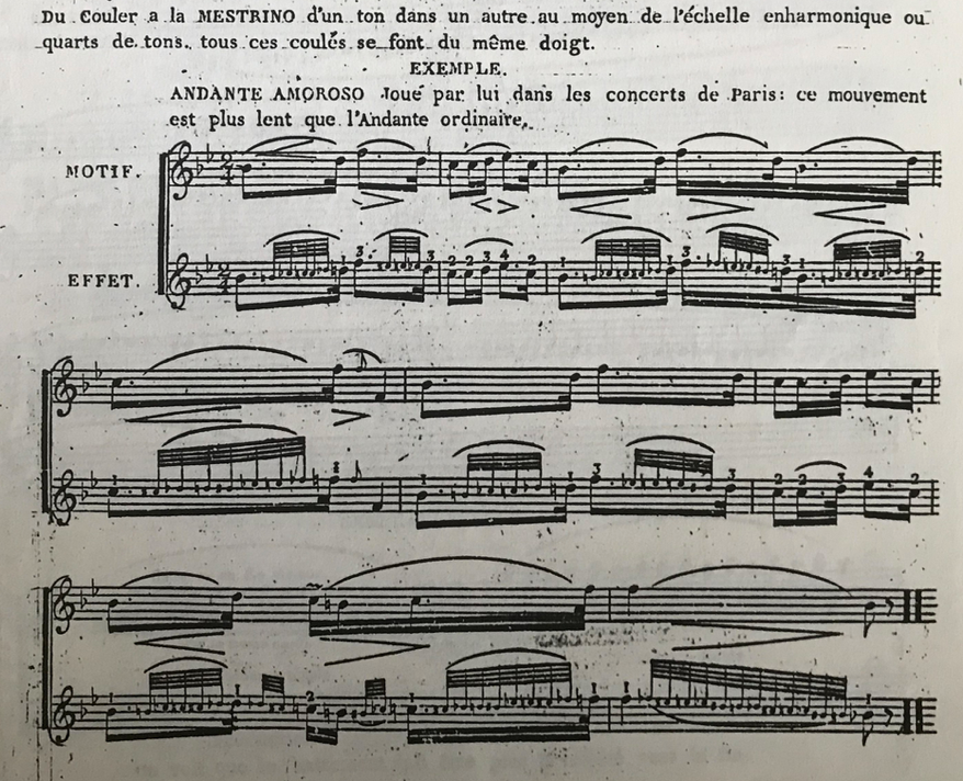 One of the earliest documented uses of portamento in 18th-century violin performance was by Nicola Mestrino (1748-1798) when he performed his Violin Concerto in B flat in 1786 in Paris.39 However, it is very likely that there was widespread use of portamenti earlier in the 18th century, as Burney’s comment in his General History (1780) states: