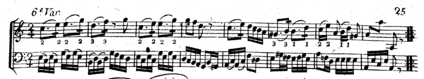 Figure 2.10: Fingerings in Lolli’s Six Sonates pour violons in C, Op. 9, No. 4, sixth variation (c1785) indicate audible shifts (portamento).