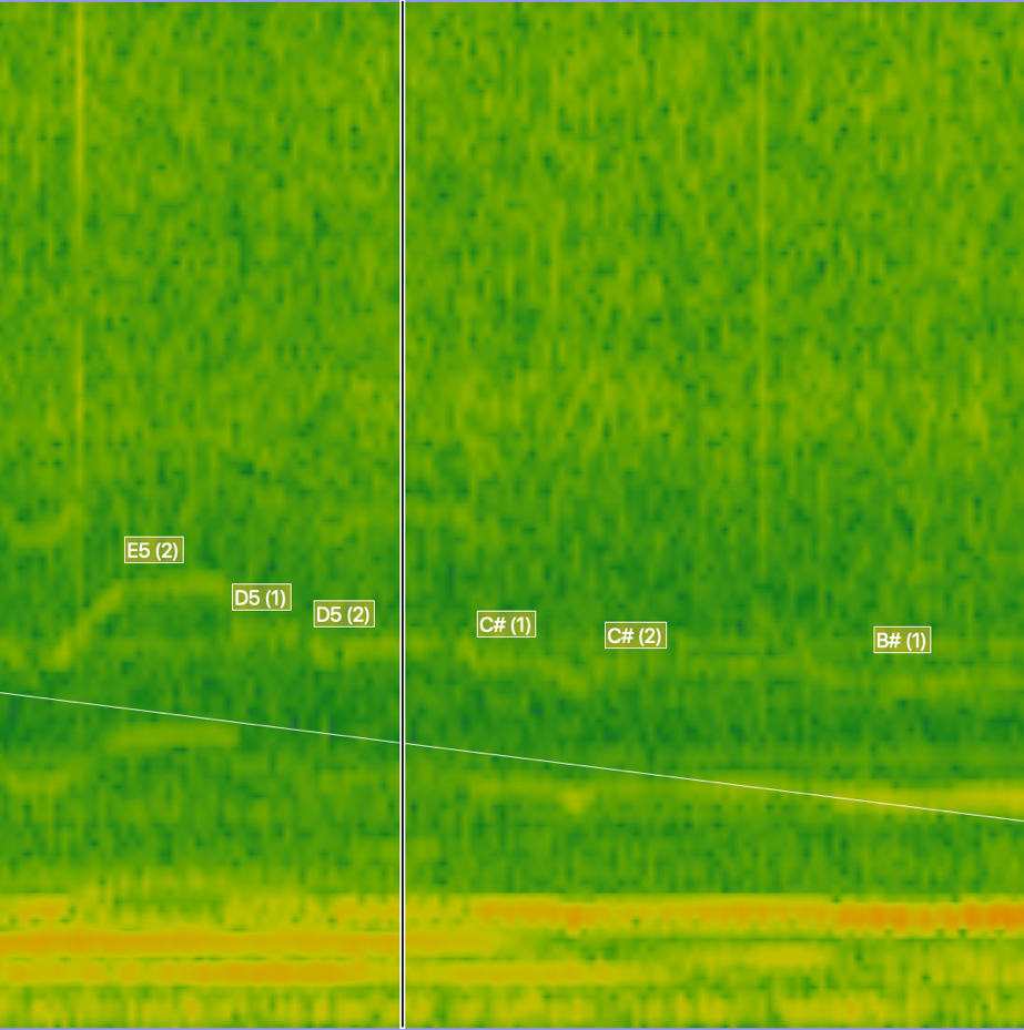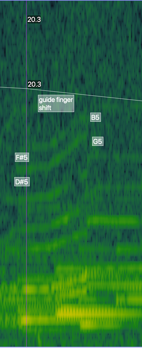• In the spectrogram images, the degree of redness of the fundamental pitch does not necessarily give an accurate reading for dynamic or air/bow pressure as it is often distorted by the sound of the piano. Hence, it is best to look at the density of green lines in the upper partials for each soloist to judge air and bow pressure and dynamic more accurately