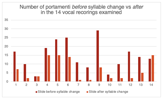 The written sources of the 19th century generally advised to use portamento in moderation, but the early recordings examined show many more portamenti than expected throughout each piece, so it is hard to quantify “moderation.” It is clear from the early recordings that there were more portamenti used in slower or sentimental pieces than in faster or lively pieces. In the recordings of Chaminade’s L'Été and Gounod’s Jewel Song we see far fewer portamenti per bar than the recordings of Mozart’s Voi, che sapete and Batti, batti, Bishop’s Home, Sweet Home, and Schubert’s Am Meer, all of which are slower and sometimes more sentimental or nostalgic pieces, lending themselves to more frequent use of portamento. However, we must remember that obvious and deliberate portamenti were present in every single piece analysed. Rather than multiple portamenti per bar, as in the slower pieces, we tend to see portamenti used in key moments and in lighter and more playful ways in pieces with a jovial character: in these works, slides are often faster linear slides or the more desirable ascending exponential growth or descending exponential decay slides, and often with more release of breath during the slide.