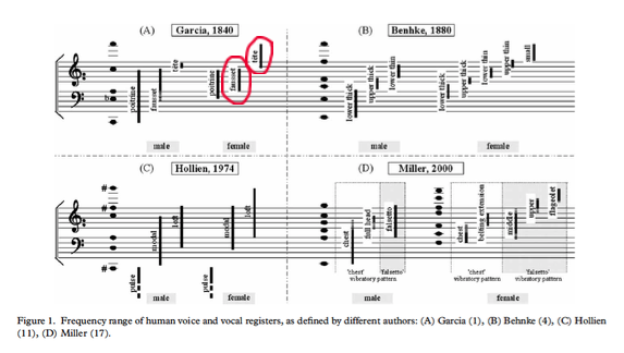 Figure 4.23: Garcia’s “fausset” and “tete” registers (indicated by red circles) in comparison to other vocal registers throughout the 19th and 20th centuries.x Most portamenti I have found in early-recorded singers lie within these pitch registers.