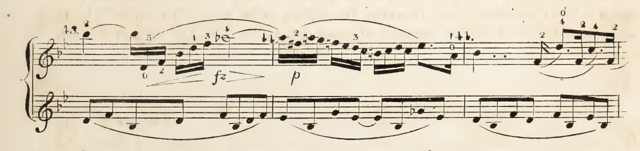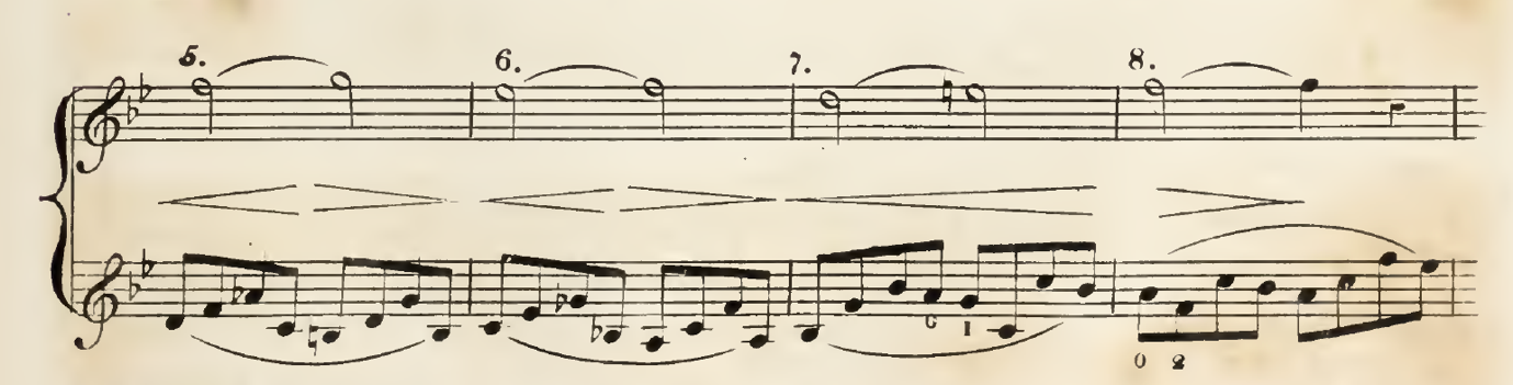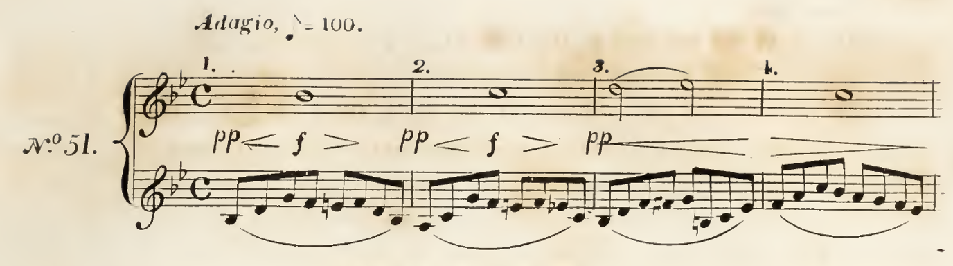 Portamento has its place chiefly in pieces in which tender sentiment is to be expressed; yet in the representation of violent passions, and in the delineation of gloom, not less than of the serene, and even in the recitativo, it may not always be dispensed with. The artist’s taste has in most cases to decide where portamento may be employed. Expressiveness is both the object and the effect of the portamento, no matter whether love, grief, or joy be the emotions to be characterised. Still, as observed above, tender sentiment can least do without it.51