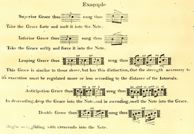 Greco recorded Corri’s graces, noting the dynamic indications for each example: releasing breath pressure and dynamic during the superior grace, increasing breath pressure and dynamic during the inferior grace, increasing breath pressure and dynamic during the leaping graces, and releasing then increasing breath pressure and dynamic during the anticipation graces (Fig. 5.3).24