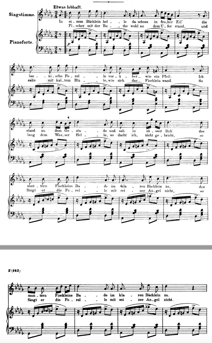 The fourth movement of Schubert’s “Trout” Quintet is a set of variations on Schubert’s Lied, Die Forelle (The Trout), D. 550 (1816) (Fig. 5.28). This playful song describes a “darting” and “happy” trout swimming in a brook (Fig. 5.29). David Greco’s recording captures this character very effectively with his use of lively portamenti, using a variety of speeds and shapes of slides and using both before and after destination syllable slides throughout. After recording and listening to Greco’s performance of the Lied, my piano quintet and I tried to take inspiration from the voice and use simple and playful portamenti in the opening theme of the fourth movement of the “Trout” Quintet. Our portamento use can be heard in the recording and annotated score in Fig. 5.30. In the limited time we had it was difficult to find a convincing way to imitate the subtle and playful vocal portamenti in our string playing. It is interesting to note these difficulties so that further study can be done in the execution of playful portamenti in this context, as I feel we did not achieve a convincing result.