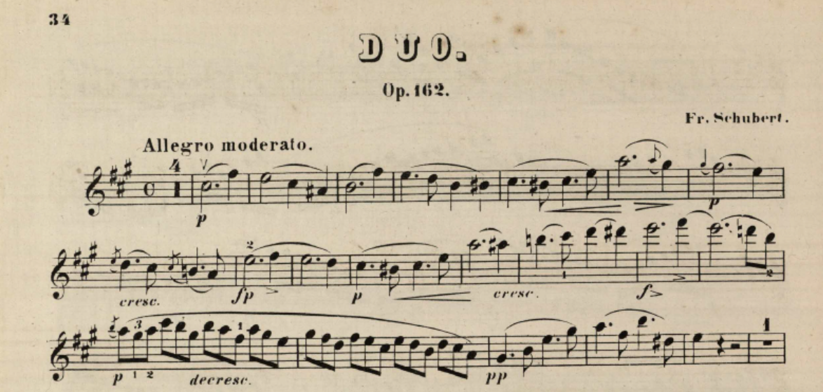 Figure 5.17: excerpt of Schubert’s Violin Sonata in A Major, Op. 162: Allegro moderato, opening 25 bars, without annotations from surveyed string players.52