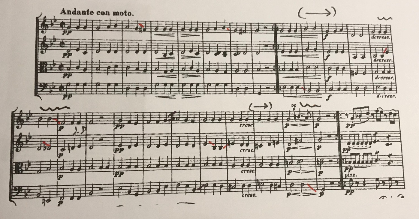 Figure 5.26: Annotated score of artistic experimentation of “Der Tod und das Mädchen” String Quartet: Andante con moto (first version). Note that red markings indicate guide-finger slides before the bow change, purple indicate destination-finger slides after the bow change, and black indicate dynamic and tempo markings.58
