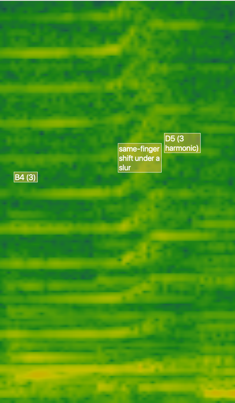Figure 5.22: spectrogram image of my same-finger (3rd-finger) shifts with varying bow pressure and speed either under a slur or before a bow change.