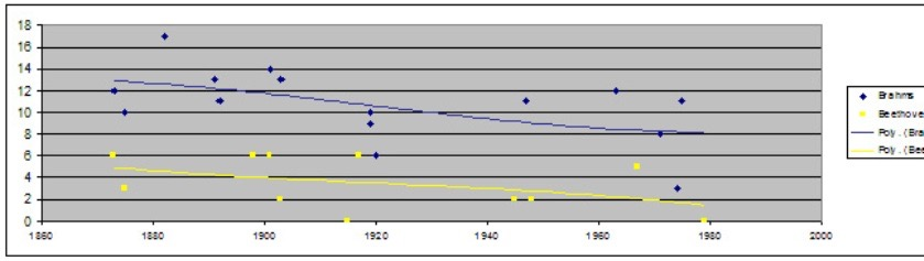 Figure 5.2: Daniel Leech-Wilkinson’s analysis of the decline in number of portamenti found in recordings of Beethoven and Brahms extracts by birth year of player during the late-19th and 20th centuries.15 The points on the graph indicate the number of portamenti in each recording (purple = Brahms, yellow = Beethoven), and declining diagonal lines indicate the change in numbers of portamenti present in recordings over time of some 50% (purple = Brahms, yellow = Beethoven).