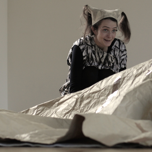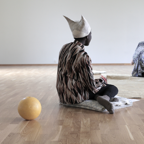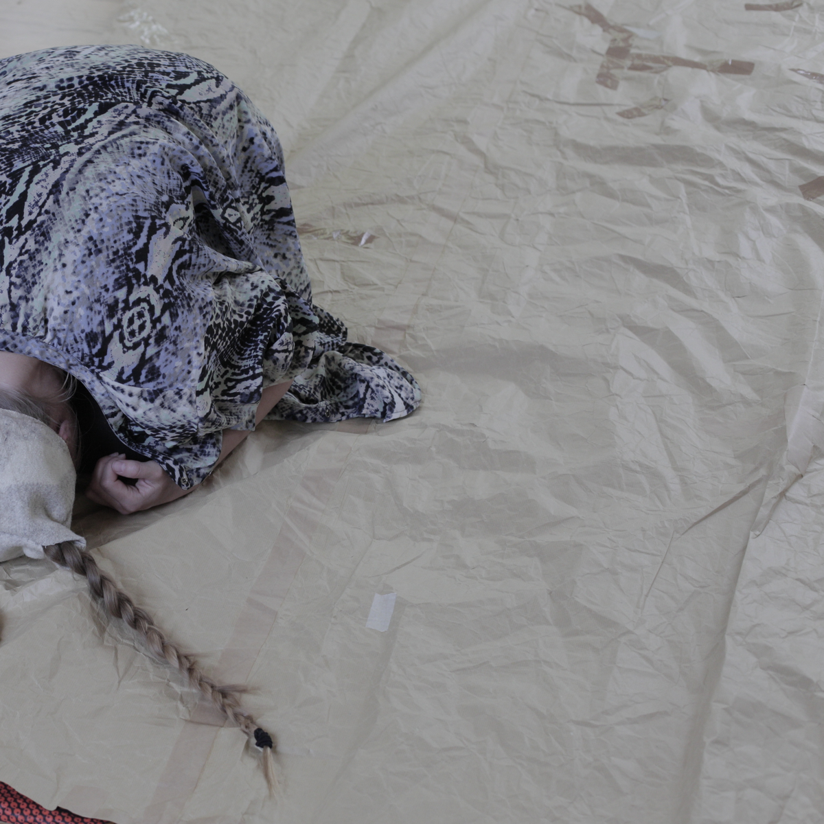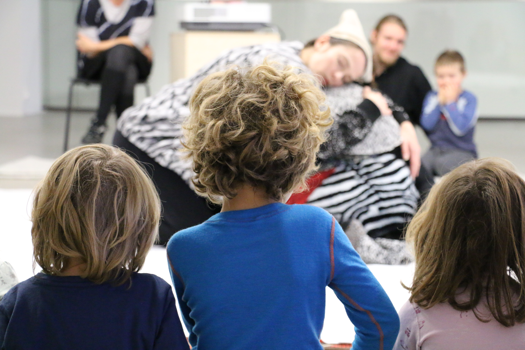 Rommet, materialiteten, musikken og kroppene er likeverdige aktører i denne forestillingen. Alle er aktører, både utøverne på scenen og publikum bestående av små barn og voksne som sitter rundt på alle fire sider. Også sceneinstallasjonene, rommets lys og skygger og ikke minst lyden i rommet, må betraktes som aktører i-seg-selv. Det handler ikke lenger så mye om sosial og musisk interaksjon (selv om dette er et grunnlag), men om intra-aksjoner (Barad, 2003, 2007; Taguchi, 2012). Hendelsens aktører er ikke bare mennesker, men også ikke-menneskelige materialiteter og virkningen av disse. Ting som vi vanligvis ser på som redskaper for interaksjon; scenerommet, materialene og ikke minst musikkens virkninger eller affekter blir her samspillende og medskapende aktører i hendelsen. Vi har latt oss inspirere av en slik ny-materialistisk tilnærming til de skapende prosessene, og funnet metoder som ikke bygger på en subjektivistisk eller psykologisk forståelse av scenens hendelser. I forprosjektet, som ledet til forestillingen Baby Becomings, lot vi musikken og materialene få lede scenens handlinger i kraft av det lyttende samspillet som oppsto mellom både menneskelige og ikke-menneskelige agenter. Da vi begynte å arbeide med Begynnelser tok vi i bruk metoder for å utvikle det affektive i en mer emosjonell betydning, der også mer gjenkjennelige narrativer spilte seg ut. På denne måten arbeidet vi fram figurer, monstre og fantasidyr som vi matet med bestemte følelser, først og fremst grunnaffektene glede, frykt og sorg (Spinoza, 2009).