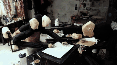 From Pygmalion, Pinocchio and ‘The Sandman’ to the Puppet Master-franchise and Metropolis, fugitive puppets have been creeping, scheming and upsetting our notions of the stable and differentiated human individual for centuries.21 Why shouldn’t they also invade the life studio? In the opening scene of the 1989 film Puppet Master, the puppeteer André Toulon finishes painting his latest magic-sentient-animate puppet and hides it in a puppet chest before putting a gun in his mouth and destroying himself. The rest of the film follows standard killer-toy horror formulas.22 Although the Puppet Master-franchise currently boasts twelve sequels, the first film is defined by its decision to immediately dispatch the puppeteer and cast the puppets adrift. The function of these puppets is never clear, but their malfunctions as ‘innocent’ objects quickly turn bloody. Puppets and matters of control, mastery and rebellion are inextricable. In the infamous E.T.A. Hoffmann story ‘The Sandman’ from which this exposition steals its title (‘Spin, puppet, spin!’), the most disturbing scene — among several — describes the protagonist Nathaniel entering the clandestine puppeteer Spalanzani’s studio to see him wrestling with the man who made the automaton Olimpia’s eyes.23 The optician, named Coppelius, wrests free her inanimate body and escapes with her, leaving her eyes behind on the floor. At the story’s climax, Nathaniel, unable to distinguish human from puppet, screams at his betrothed Clara, ‘Spin, puppet, spin!’ before crashing from a tower to his death, while the sandman Coppelius looks on. Although Olimpia malfunctions by betraying the first aspect of a puppet’s double vision, it is Nathaniel who loses his Self in his inability to recognise her nature, and his death is the price of that estrangement.